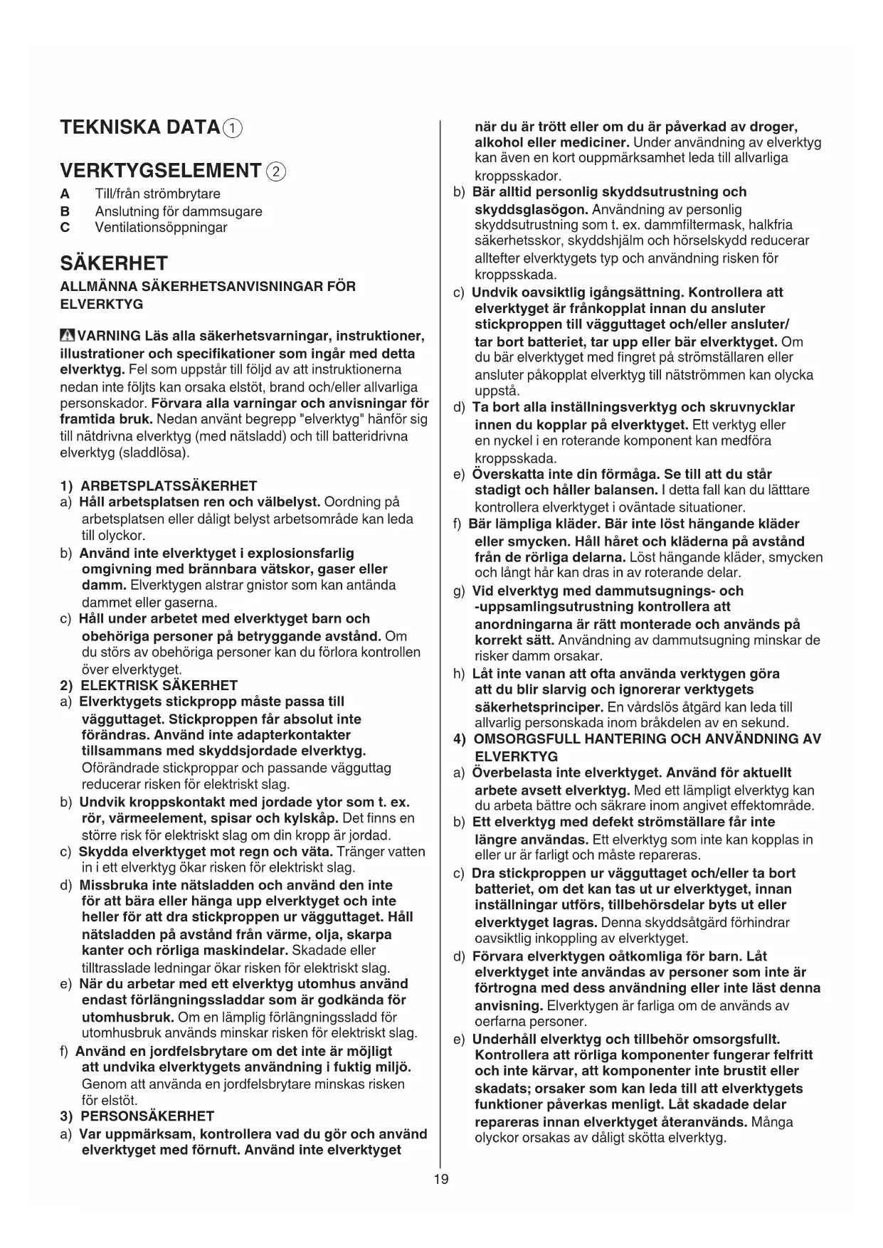 SÄKERHET ALLMÄNNA SÄKERHETSANVISNINGAR FÖR ELVERKTYG VARNING Läs alla säkerhetsvarningar, instruktioner,