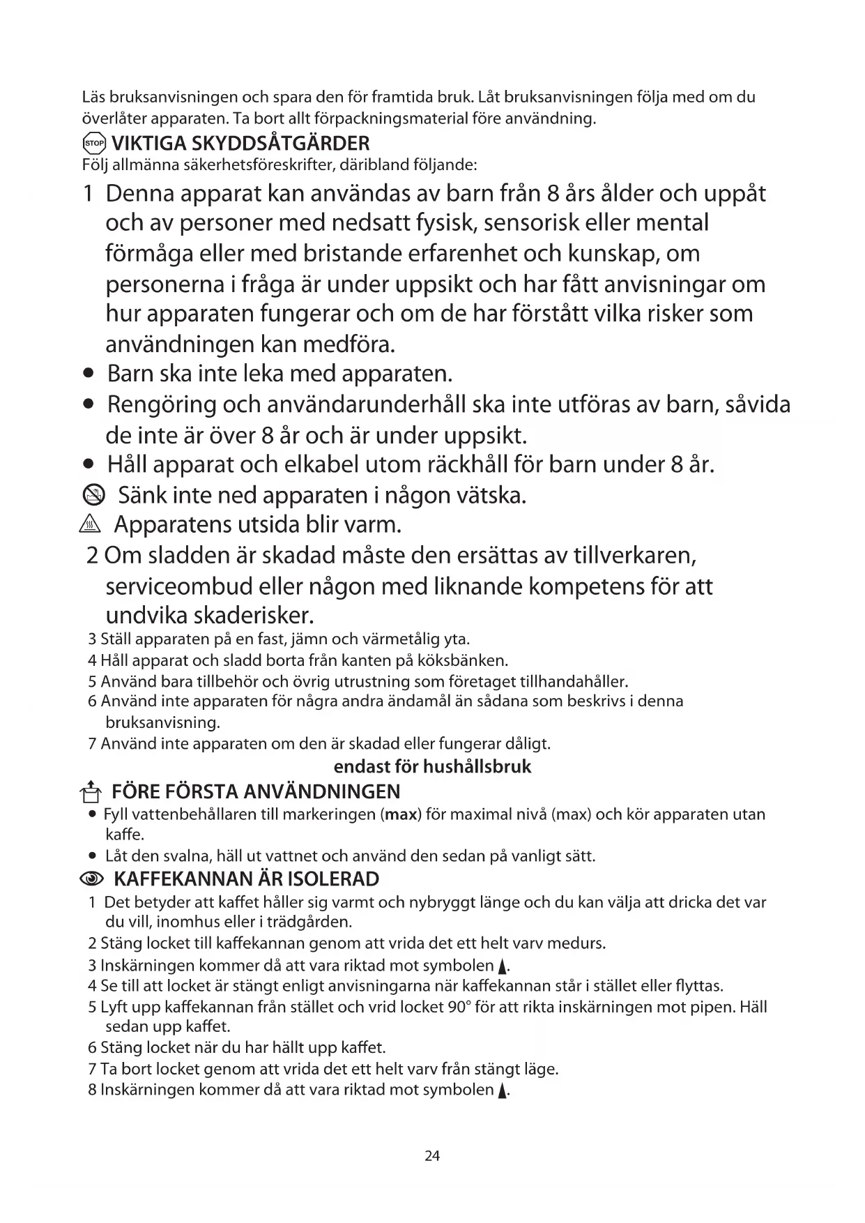 •Håll apparat och elkabel utom räckhåll för barn under 8 år.