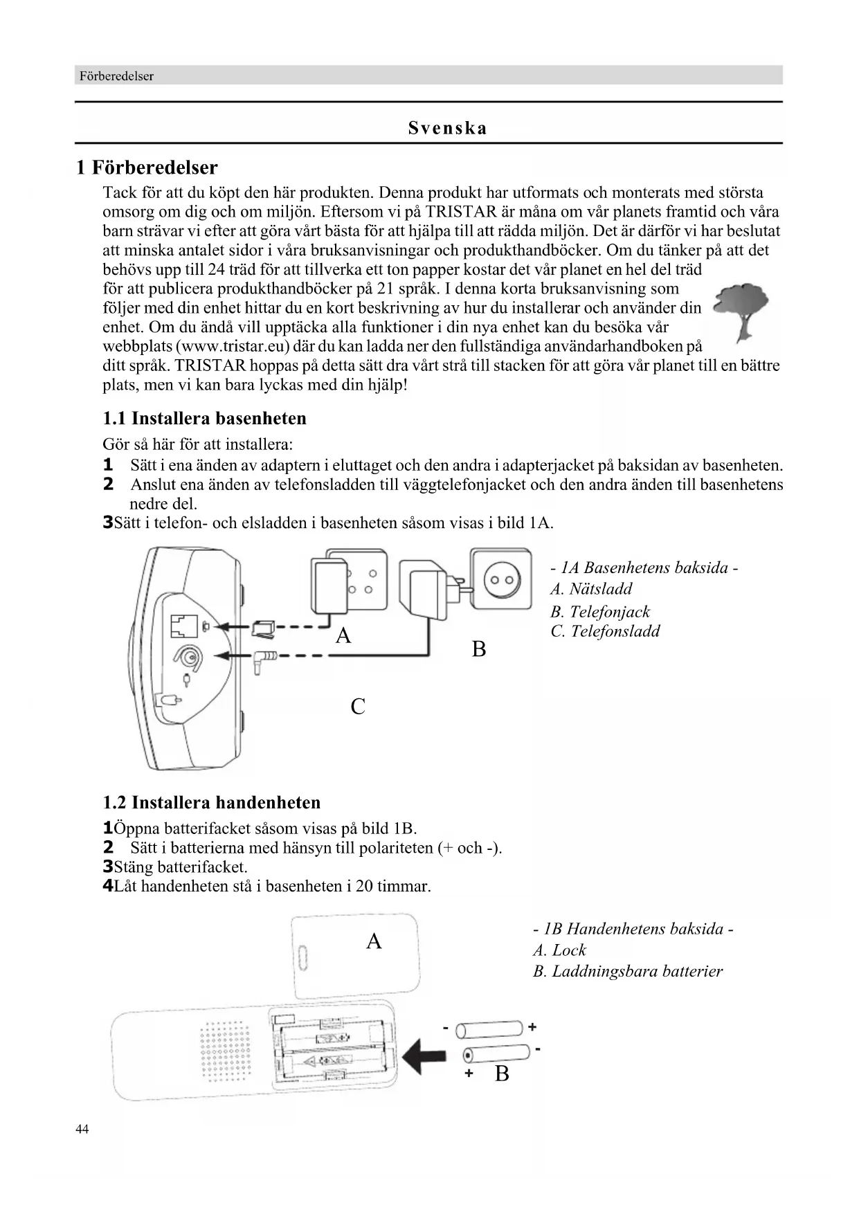 1 Öppna batterifacket såsom visas på bild 1B. 2 Sätt i batterierna med hänsyn till polariteten (+ och -). 3 Stäng batterifacket. 4 Låt handenheten stå i basenheten i 20 timmar.