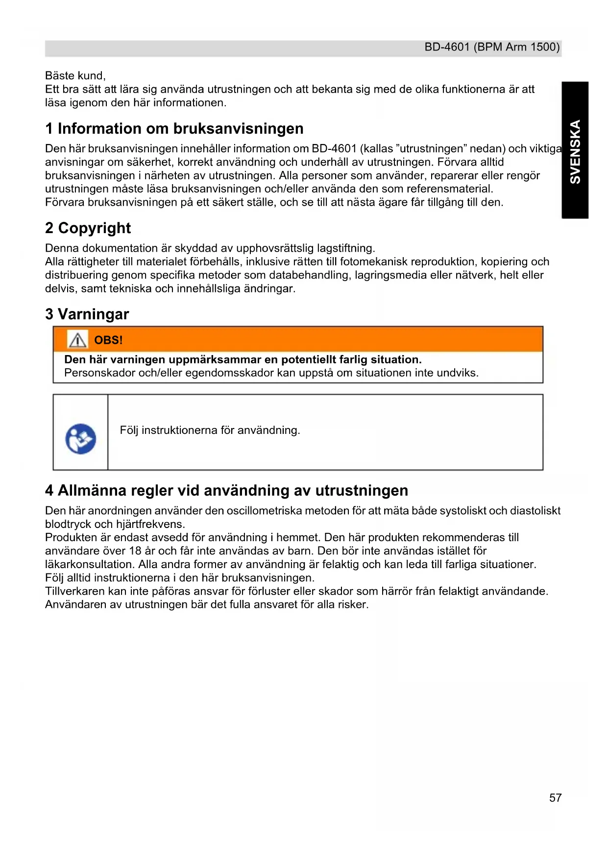 Los daños o defectos ocasionados por un tratamiento o funcionamiento incorrectos, así como los daños resultantes del uso de piezas o accesorios no originales, no estarán cubiertos por esta garantía. La garantía no cubre los daños ocasionados por factores externos tales como relámpagos, agua o fuego como tampoco los daños causados durante el transporte. La garantía no será válida si el número de serie de las unidades se cambia, se elimina o resulta ilegible. Cualquier reclamación de la garantía se invalidará si la unidad ha sido reparada, alterada o modificada por el comprador. Para garantizar una lectura exacta de la medición, se recomienda recalibrar el dispositivo transcurridos dos años desde la fecha de adquisición. El porte y los gastos del servicio de gestión y recalibración se cobrarán debidamente. Para obtener más información, consulte www.tristar.eu57 SVENSKA BD-4601 (BPM Arm 1500) Bäste kund, Ett bra sätt att lära sig använda utrustningen och att bekanta sig med de olika funktionerna är att läsa igenom den här informationen. 1 Information om bruksanvisningen Den här bruksanvisningen innehåller information om BD-4601 (kallas ”utrustningen” nedan) och viktiga anvisningar om säkerhet, korrekt användning och underhåll av utrustningen. Förvara alltid bruksanvisningen i närheten av utrustningen. Alla personer som använder, reparerar eller rengör utrustningen måste läsa bruksanvisningen och/eller använda den som referensmaterial. Förvara bruksanvisningen på ett säkert ställe, och se till att nästa ägare får tillgång till den. 2 Copyright Denna dokumentation är skyddad av upphovsrättslig lagstiftning. Alla rättigheter till materialet förbehålls, inklusive rätten till fotomekanisk reproduktion, kopiering och distribuering genom specifika metoder som databehandling, lagringsmedia eller nätverk, helt eller delvis, samt tekniska och innehållsliga ändringar. 3 Varningar OBS! Den här varningen uppmärksammar en potentiellt farlig situation. Personskador och/eller egendomsskador kan uppstå om situationen inte undviks. Följ instruktionerna för användning. 4 Allmänna regler vid användning av utrustningen Den här anordningen använder den oscillometriska metoden för att mäta både systoliskt och diastoliskt blodtryck och hjärtfrekvens. Produkten är endast avsedd för användning i hemmet. Den här produkten rekommenderas till användare över 18 år och får inte användas av barn. Den bör inte användas istället för läkarkonsultation. Alla andra former av användning är felaktig och kan leda till farliga situationer. Följ alltid instruktionerna i den här bruksanvisningen. Tillverkaren kan inte påföras ansvar för förluster eller skador som härrör från felaktigt användande. Användaren av utrustningen bär det fulla ansvaret för alla risker.58 BD-4601 (BPM Arm 1500) OBS!