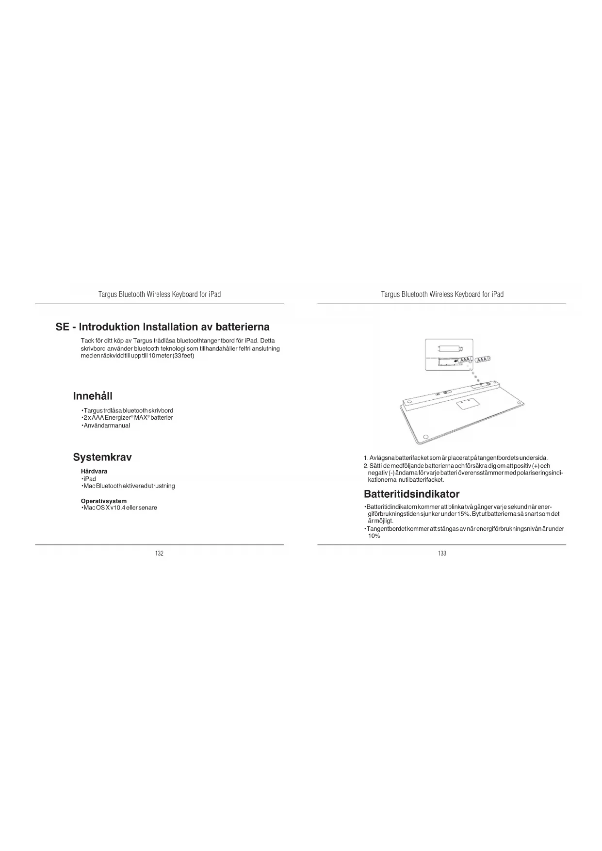 Funktion Hemmaskärm Sök iPad kommer att gå in i läget för fotoramVisa eller dölj skrivbordet på din skärmSpola tillbaka eller gå till tidigare låtar, lmer, eller bildspelSpola snabbt framåt låtar, lmer, eller bildspelSpela upp eller pausa låtar, lmer, eller bildspelStäng av ljudet på din iPadSänk volymen på din iPadÖka volymen på din iPadLås din skärm Bluetooth anslutning: MAC 1. Gå till bluetoothikonen som är placerad på ditt skrivbord eller i systemmenyn och klicka därefter på ikonen för att börja installationen. Välj “Turn Bluetooth On” (“Sätt på bluetooth”) för att aktivera bluetoothfunktionen på din Mac. 2. Scrolla nedåt i listan och välj “Set up Bluetooth Device...” (“Ställ in bluetoothenhet”) 3. Assistenten för bluetoothinstallationen kommer att startas. Var vänlig att följ instruktionerna som syns på skärmen. 4. Välj “keyboard” (“tangentbord”) och klicka därefter på fortsätt för att låta installationen fortgå. Du kommer att behöva ha ditt tangetbord i “discovery” (“undersöknings”) läge för att ansluta. 5. Tryck in anslutningsknappen på baksidan av ditt Targus trådlösa bluetoothtangentbord för att aktivera undersökningsläge. Indikatorlampan som anger att energinivån är låg kommer att lysa i blått när tangentbordet är satt i undersökningsläge. 6. Din dator kommer att börja söka efter tangentbordet. Då tangentbordet har hittats, kommer det att dyka upp i listan. Markera “Bluetooth Keyboard” (“Bluetooth Tangetbord”) och tryck därefter på fortsätt. 7. Bluetoothtangentbordet kommer nu börja att förena sig. Klick på fortsätt för att fortgå. 8. Grattis. Ditt bluetoothtangentbord har nu installerats och är nu redo att användas. Du kan välja att installera en annan enhet genom att klicka på avsluta för att gå ur installationen.Targus Bluetooth Wireless Keyboard for iPad