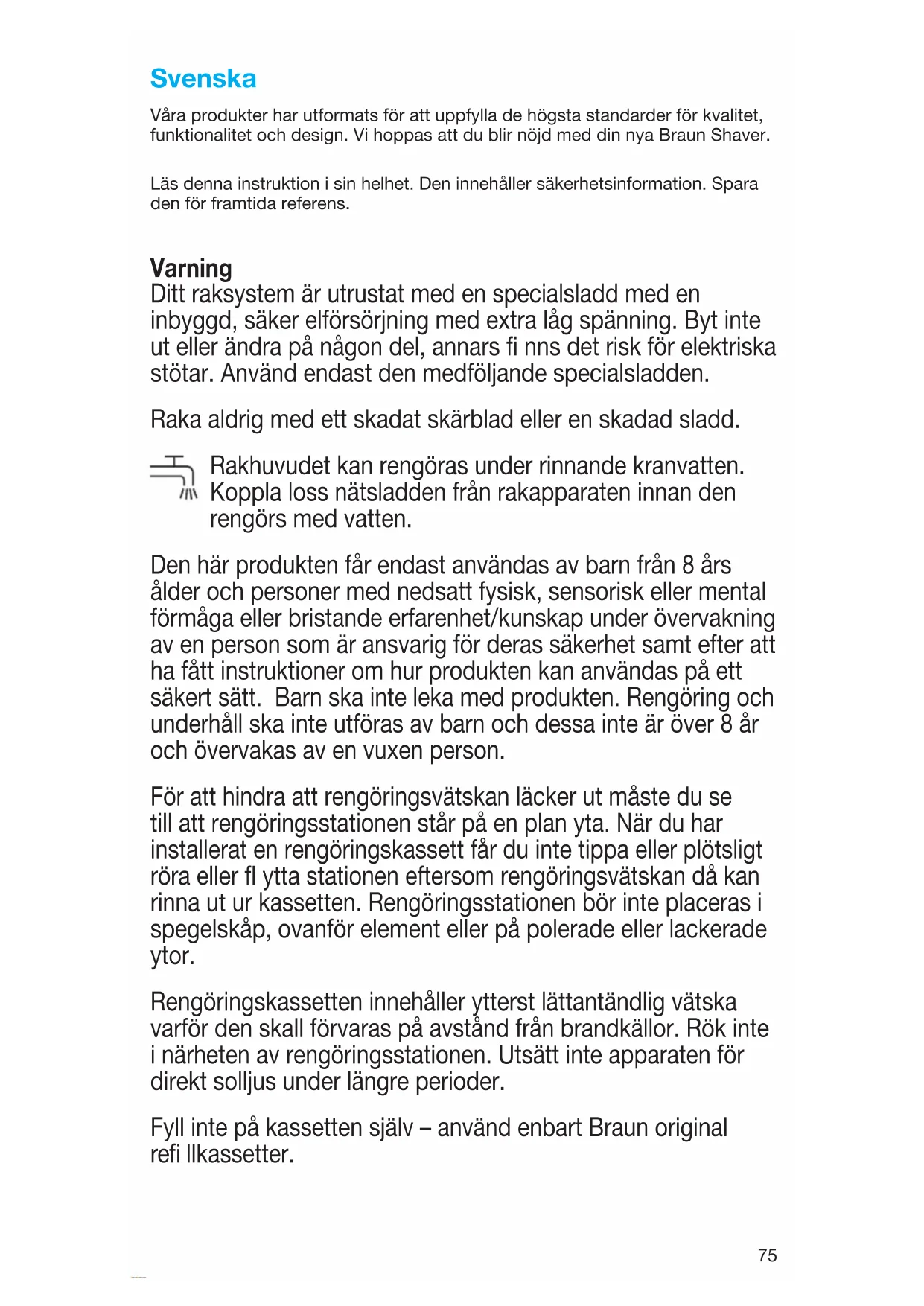 Ladda ner instruktionerna för din Rakhyvel i PDF-format gratis! Hitta din manual Series 7750cc - BRAUN och ta tillbaka ditt elektroniska enhet i hand. På denna sida publiceras alla dokument som behövs för att använda din enhet. Series 7750cc av märket BRAUN.