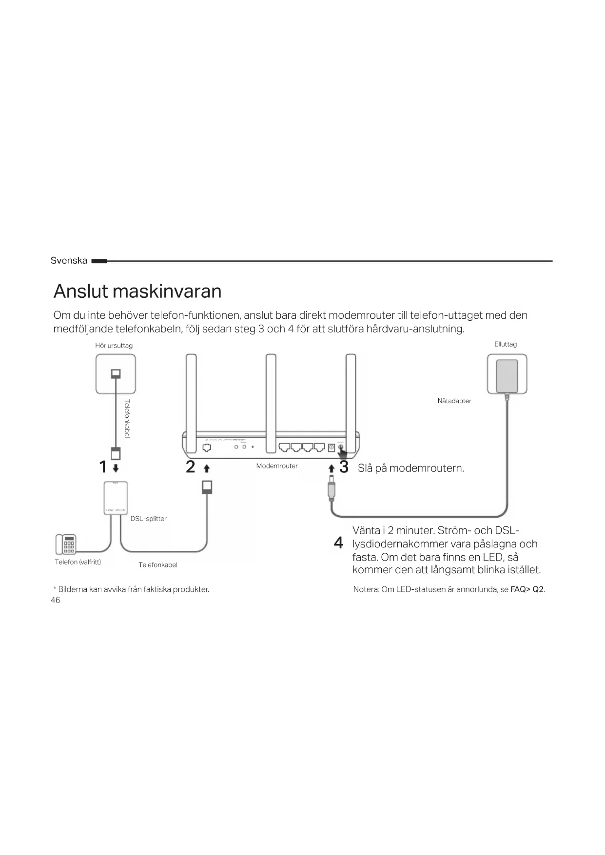 kommer den att långsamt blinka istället. HörlursuttagTelefonkabelModemrouter Slå på modemroutern. ElluttagDSL-splitter Telefon (valfritt)TelefonkabelNätadapter47