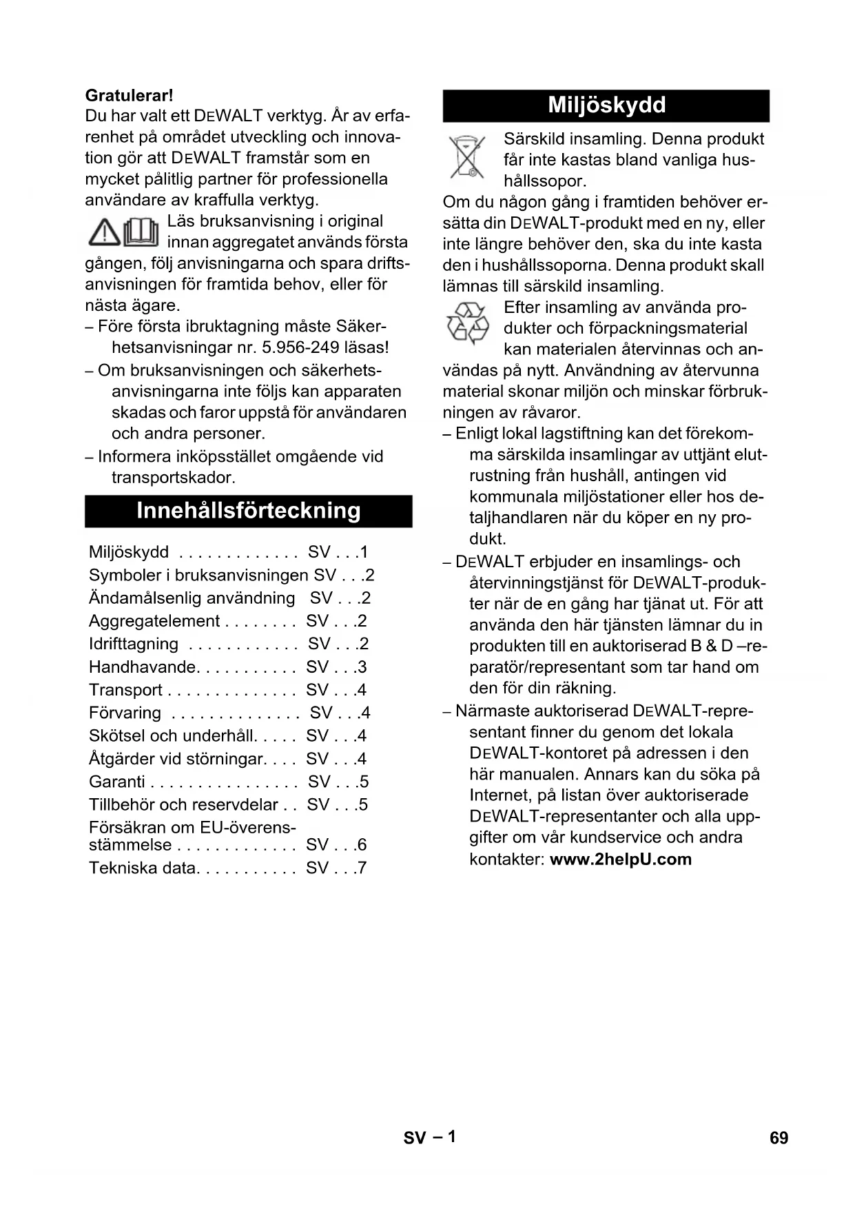 - EWALT-representanter och alla upp- gifter om vår kundservice och andra kontakter: www.2helpU.com Innehållsförteckning Miljöskydd