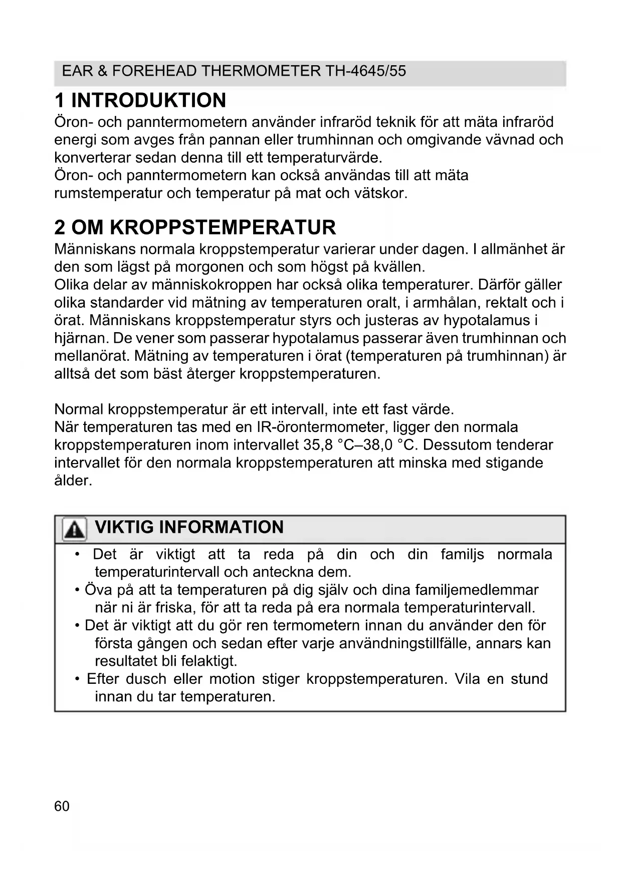 1 INTRODUKTION Öron- och panntermometern använder infraröd teknik för att mäta infraröd energi som avges från pannan eller trumhinnan och omgivande vävnad och konverterar sedan denna till ett temperaturvärde. Öron- och panntermometern kan också användas till att mäta rumstemperatur och temperatur på mat och vätskor. 2 OM KROPPSTEMPERATUR Människans normala kroppstemperatur varierar under dagen. I allmänhet är den som lägst på morgonen och som högst på kvällen. Olika delar av människokroppen har också olika temperaturer. Därför gäller olika standarder vid mätning av temperaturen oralt, i armhålan, rektalt och i örat. Människans kroppstemperatur styrs och justeras av hypotalamus i hjärnan. De vener som passerar hypotalamus passerar även trumhinnan och mellanörat. Mätning av temperaturen i örat (temperaturen på trumhinnan) är alltså det som bäst återger kroppstemperaturen. Normal kroppstemperatur är ett intervall, inte ett fast värde. När temperaturen tas med en IR-örontermometer, ligger den normala kroppstemperaturen inom intervallet 35,8 °C–38,0 °C. Dessutom tenderar intervallet för den normala kroppstemperaturen att minska med stigande ålder. VIKTIG INFORMATION