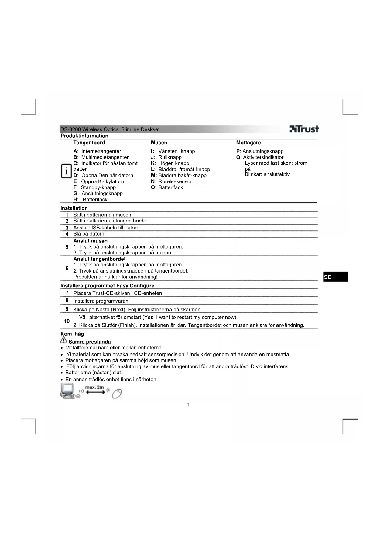 - Reproduktion av den här bruksanvisningen, eller någon del av den, utan tillstånd från Trust International B.V. är förbjuden.DS-3200 Wireless Optical Slimline Deskset