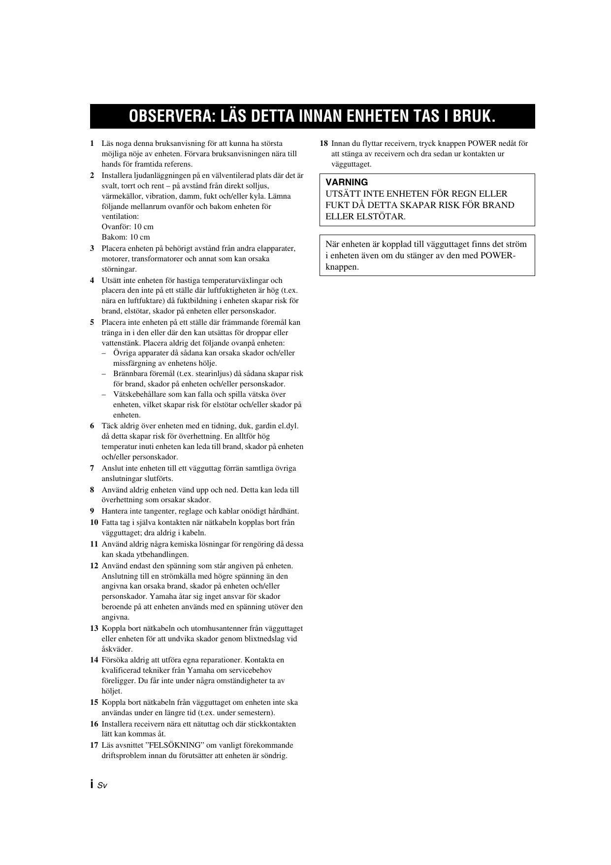 OBSERVERA: LÄS DETTA INNAN ENHETEN TAS I BRUK. 1 Läs noga denna bruksanvisning för att kunna ha största möjliga nöje av enheten. Förvara bruksanvisningen nära till hands för framtida referens. 2 Installera ljudanläggningen på en välventilerad plats där det är svalt, torrt och rent – på avstånd från direkt solljus, värmekällor, vibration, damm, fukt och/eller kyla. Lämna följande mellanrum ovanför och bakom enheten för ventilation: Ovanför: 10 cm Bakom: 10 cm 3 Placera enheten på behörigt avstånd från andra elapparater, motorer, transformatorer och annat som kan orsaka störningar. 4 Utsätt inte enheten för hastiga temperaturväxlingar och placera den inte på ett ställe där luftfuktigheten är hög (t.ex. nära en luftfuktare) då fuktbildning i enheten skapar risk för brand, elstötar, skador på enheten eller personskador. 5 Placera inte enheten på ett ställe där främmande föremål kan tränga in i den eller där den kan utsättas för droppar eller vattenstänk. Placera aldrig det följande ovanpå enheten: – Övriga apparater då sådana kan orsaka skador och/eller missfärgning av enhetens hölje. – Brännbara föremål (t.ex. stearinljus) då sådana skapar risk för brand, skador på enheten och/eller personskador. – Vätskebehållare som kan falla och spilla vätska över enheten, vilket skapar risk för elstötar och/eller skador på enheten. 6 Täck aldrig över enheten med en tidning, duk, gardin el.dyl. då detta skapar risk för överhettning. En alltför hög temperatur inuti enheten kan leda till brand, skador på enheten och/eller personskador. 7 Anslut inte enheten till ett vägguttag förrän samtliga övriga anslutningar slutförts. 8 Använd aldrig enheten vänd upp och ned. Detta kan leda till överhettning som orsakar skador. 9 Hantera inte tangenter, reglage och kablar onödigt hårdhänt. 10 Fatta tag i själva kontakten när nätkabeln kopplas bort från vägguttaget; dra aldrig i kabeln. 11 Använd aldrig några kemiska lösningar för rengöring då dessa kan skada ytbehandlingen. 12 Använd endast den spänning som står angiven på enheten. Anslutning till en strömkälla med högre spänning än den angivna kan orsaka brand, skador på enheten och/eller personskador. Yamaha åtar sig inget ansvar för skador beroende på att enheten används med en spänning utöver den angivna. 13 Koppla bort nätkabeln och utomhusantenner från vägguttaget eller enheten för att undvika skador genom blixtnedslag vid åskväder. 14 Försöka aldrig att utföra egna reparationer. Kontakta en kvalificerad tekniker från Yamaha om servicebehov föreligger. Du får inte under några omständigheter ta av höljet. 15 Koppla bort nätkabeln från vägguttaget om enheten inte ska användas under en längre tid (t.ex. under semestern). 16 Installera receivern nära ett nätuttag och där stickkontakten lätt kan kommas åt. 17 Läs avsnittet ”FELSÖKNING” om vanligt förekommande driftsproblem innan du förutsätter att enheten är söndrig.