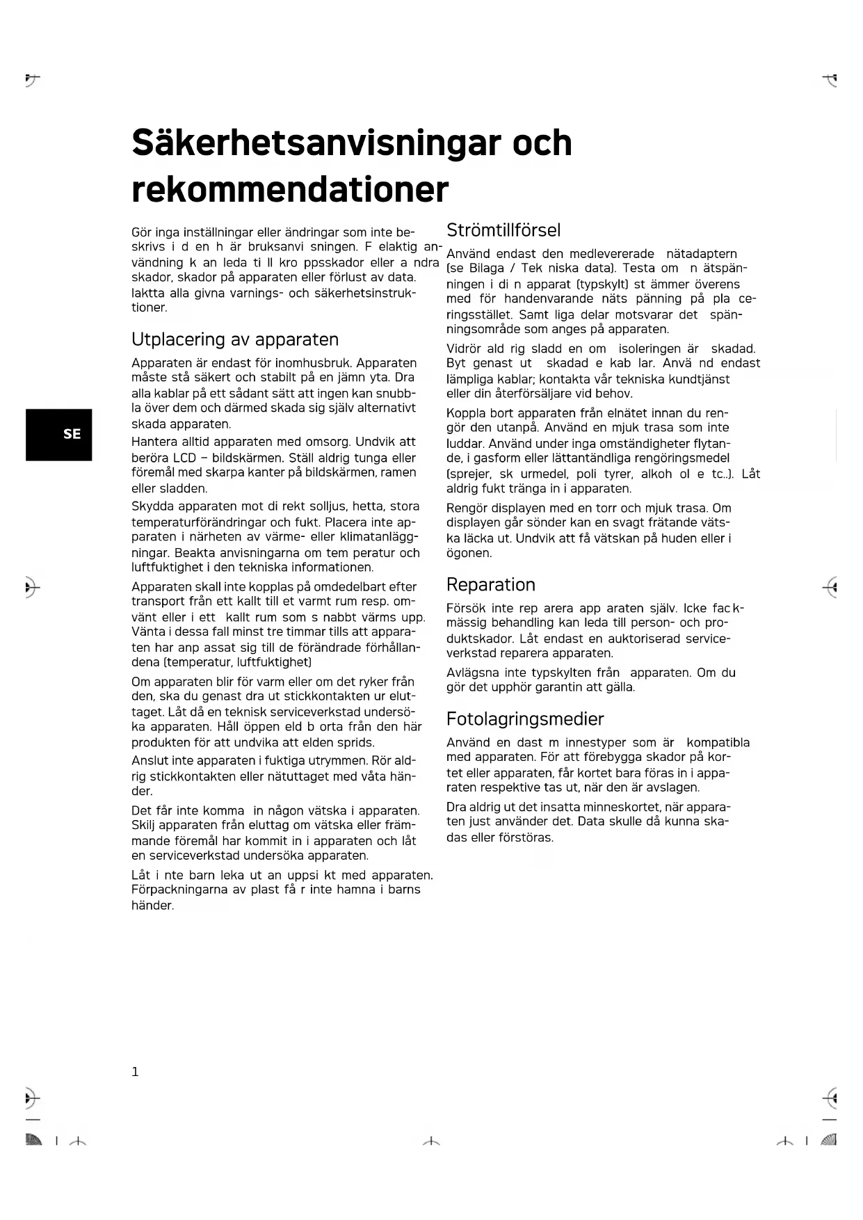 Gör inga inställningar eller ändringar som inte be- skrivs i d en h är bruksanvi sningen. F elaktig an- vändning k an leda ti ll kro ppsskador eller a ndra skador, skador på apparaten eller förlust av data. laktta alla givna varnings- och säkerhetsinstruk- tioner.