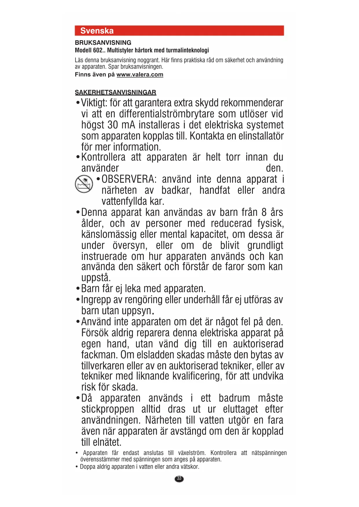 av apparaten. Spar bruksanvisningen. Finns även på www.valera.com SAKERHETSANVISNINGAR