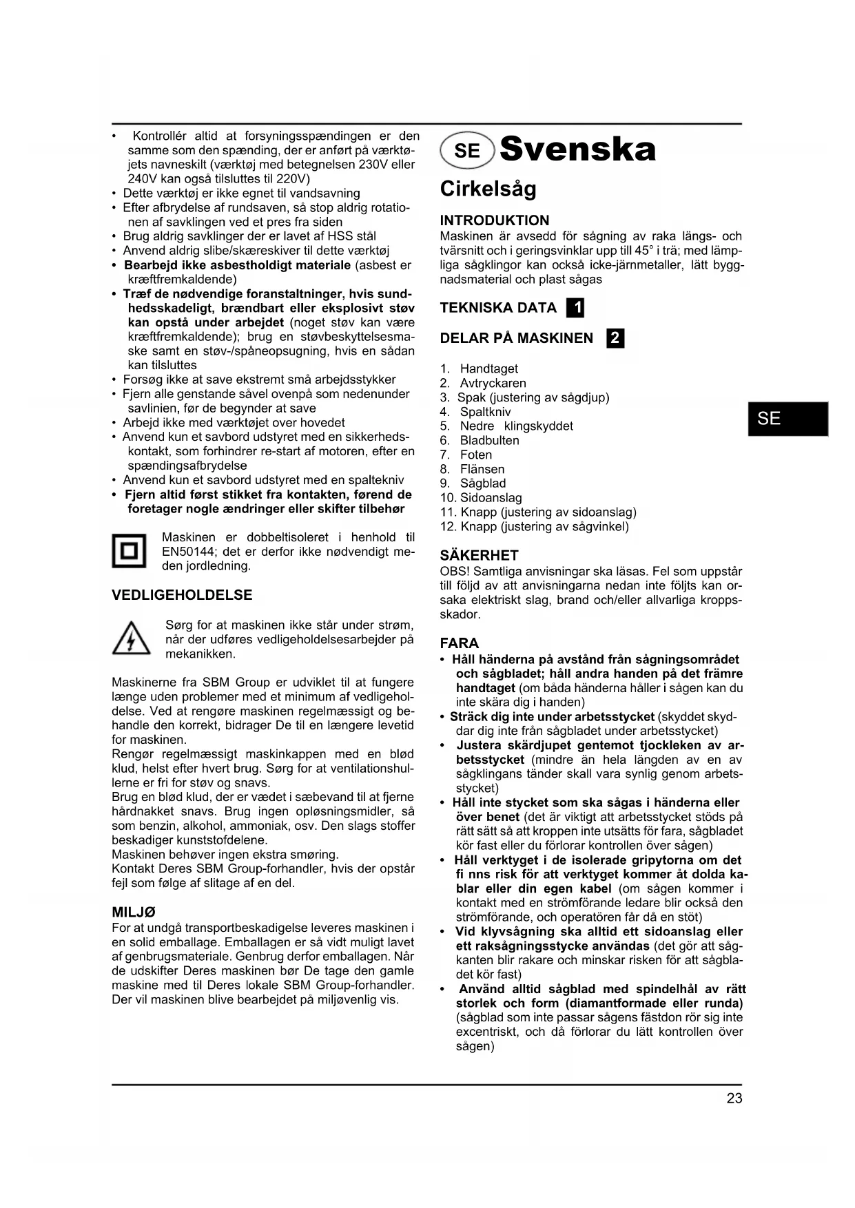 - Vidta skyddsåtgärder om risk fi nns för att häl- sovådligt, brännbart eller explosivt damm upp- står under arbetet (vissa damm klassifi ceras som cancerframkallande ämnen); använd en dammfi lter-mask och om möjligt damm-/spånutsugning• Såga ej extremt små arbetsstycken• Se till att arbetsområdet är fritt från föremål innan du startar arbetet• Använd aldrig din maskin ovanför huvudet• Använd endast sågbord som är utrustad med 0-spänningsströmbrytare som förhindrar återstart av motorn efter strömavbrott• Använd endast sågbord som är utrustad med klyv-kniven• Dra alltid ur stickkontakten från vägguttaget inn-an du gör någon justering eller byter tillbehörMaskinen är dubbelt isolerad i överensstäm-melse med EN 50144, vilket innebär att det inte behövs någon jordledare.UNDERHÅLLTillse att maskinen inte är spännings förande när underhållsarbeten utförs på de mekanis-ka delarna.SBM Groups maskiner har konstruerats för att under lång tid fungera problemfritt med ett minimalt underhåll. Genom att regelbundet rengöra maskinen och hantera den på rätt sätt bidrar du till en lång livslängd för din maskin.Rengör maskinhöljet regelbundet med en mjuk duk, företrädesvis efter varje användning. Tillse att ventila-tionsspringorna är fria från damm och smuts. Använd en mjuk duk fuktad med tvålvatten vid svår smuts. An-vänd inga lösningsmedel som bensin, alkohol, ammo-niak etc. Sådana ämnen skadar plastdelarna.Maskinen behöver ingen extra smörjning.Om en driftstörning uppträder till exempel till följd av att en del har blivit sliten, kontakta då din lokala SBM Group- återförsäljare.MILJÖFör att undvika transportskador levereras maskinen i en så stadig förpackning som möjligt. Förpackningen har så långt det är möjligt tillverkats av återvinnings-bart material. Ta därför tillvara möjligheten att återvinna förpackningen.Återlämna gamla maskiner till din lokala SBM Group-återförsäljare när du byter ut dem. Där kommer maski-nen att tas om hand på ett miljövänligt sätt.