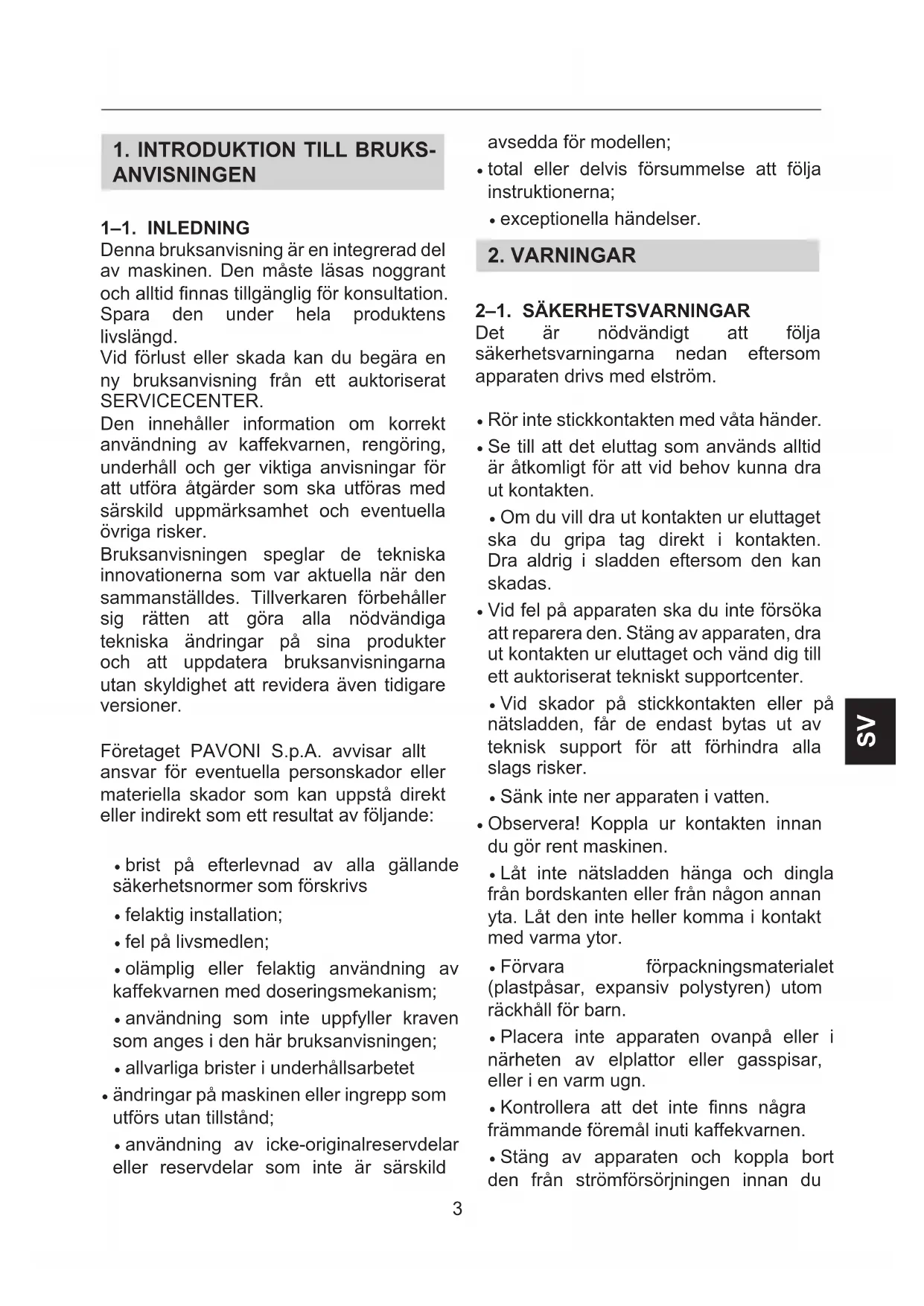 anvISnIngEn 1–1. InLEDnIng Denna bruksanvisning är en integrerad del av maskinen. Den måste läsas noggrant och alltid nnas tillgänglig för konsultation. Spara den under hela produktens livslängd. Vid förlust eller skada kan du begära en ny bruksanvisning från ett auktoriserat SERVICECENTER. Den innehåller information om korrekt användning av kaffekvarnen, rengöring, underhåll och ger viktiga anvisningar för att utföra åtgärder som ska utföras med särskild uppmärksamhet och eventuella övriga risker. Bruksanvisningen speglar de tekniska innovationerna som var aktuella när den sammanställdes. Tillverkaren förbehåller sig rätten att göra alla nödvändiga tekniska ändringar på sina produkter och att uppdatera bruksanvisningarna utan skyldighet att revidera även tidigare versioner. Företaget PAVONI S.p.A. avvisar allt ansvar för eventuella personskador eller materiella skador som kan uppstå direkt eller indirekt som ett resultat av följande: