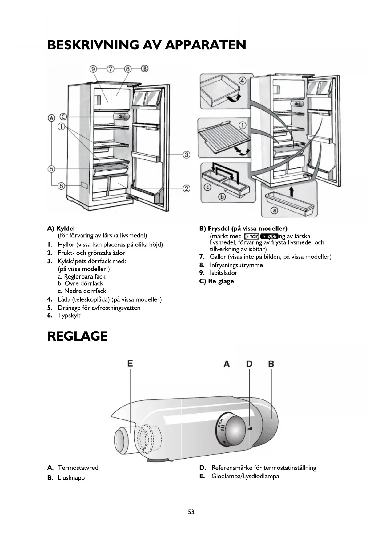FUNKTIONER Denna apparat är ett kylskåp med -stjärnig frysdel. eller ett kylskåp med -stjärnig frysdel. Apparaten fungerar bäst i rumstemperaturer mellan +10°C och +38°C. Sätta apparaten i funktion När stickkontakten är insatt i eluttaget och termostaten (1) inte står på tänds ljuset varje gång dörren öppnas. Efter att temperaturen har ställts in – enligt beskrivningen i följande avsnitt – är apparaten redo för användning. Reglering av temperaturen - Gör så här om du vill ändra temperaturen i kyldelen: vrid termostatvredet