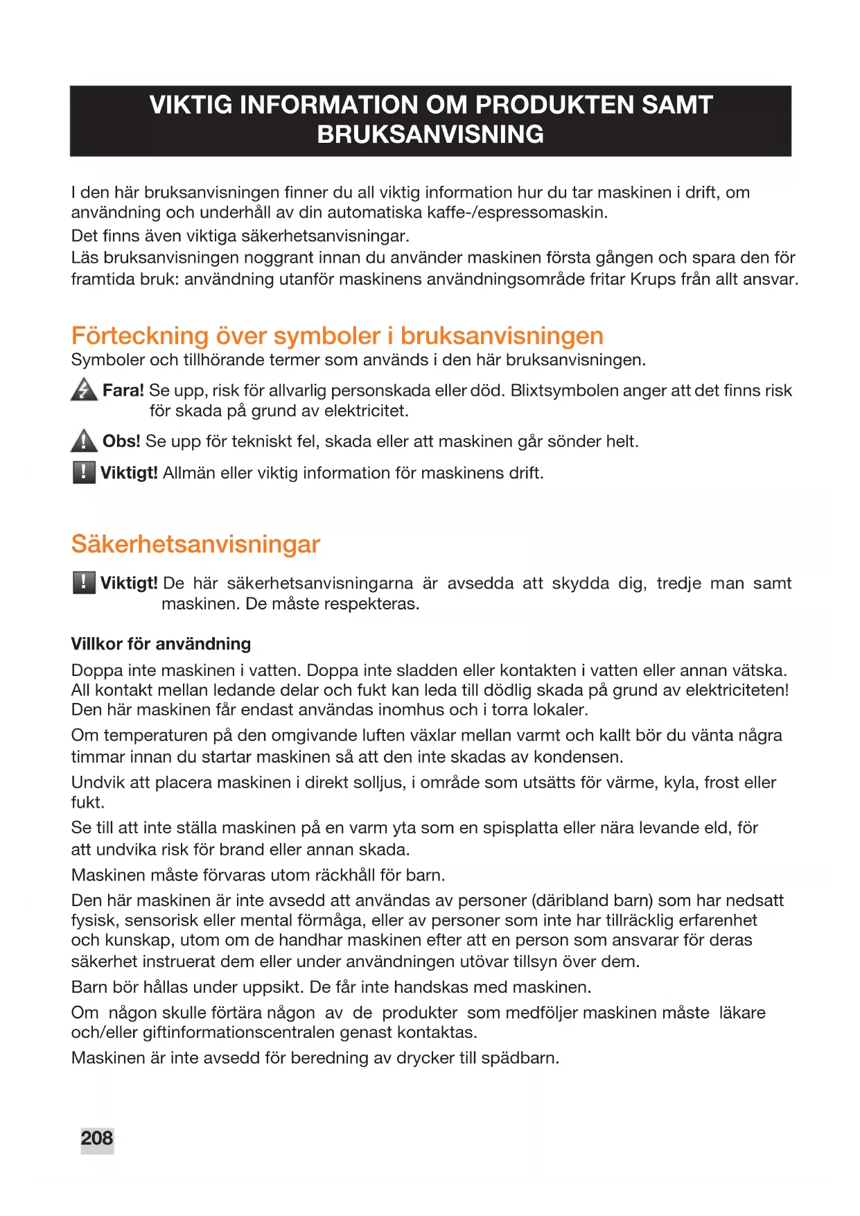 VIKTIG INFORMATION OM PRODUKTEN SAMT BRUKSANVISNING 208