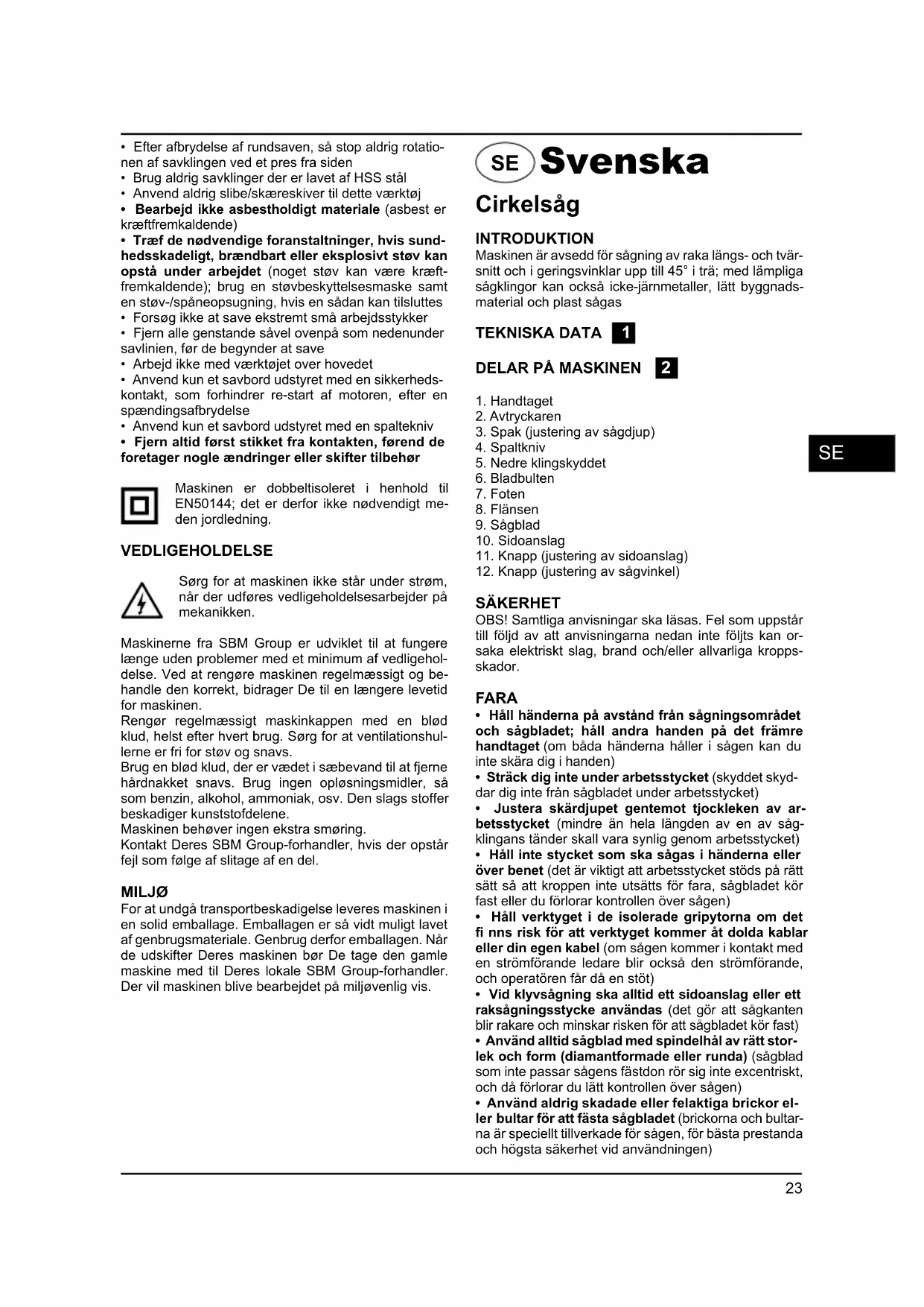 - Håll händerna på avstånd från sågningsområdet och sågbladet; håll andra handen på det främre handtaget (om båda händerna håller i sågen kan du inte skära dig i handen)• Sträck dig inte under arbetsstycket (skyddet skyd-dar dig inte från sågbladet under arbetsstycket)• Justera skärdjupet gentemot tjockleken av ar-betsstycket (mindre än hela längden av en av såg-klingans tänder skall vara synlig genom arbetsstycket)• Håll inte stycket som ska sågas i händerna eller över benet (det är viktigt att arbetsstycket stöds på rätt sätt så att kroppen inte utsätts för fara, sågbladet kör fast eller du förlorar kontrollen över sågen)• Håll verktyget i de isolerade gripytorna om det fi nns risk för att verktyget kommer åt dolda kablar eller din egen kabel (om sågen kommer i kontakt med en strömförande ledare blir också den strömförande, och operatören får då en stöt)• Vid klyvsågning ska alltid ett sidoanslag eller ett raksågningsstycke användas (det gör att sågkanten blir rakare och minskar risken för att sågbladet kör fast)• Använd alltid sågblad med spindelhål av rätt stor-lek och form (diamantformade eller runda) (sågblad som inte passar sågens fästdon rör sig inte excentriskt, och då förlorar du lätt kontrollen över sågen)• Använd aldrig skadade eller felaktiga brickor el-ler bultar för att fästa sågbladet (brickorna och bultar-na är speciellt tillverkade för sågen, för bästa prestanda och högsta säkerhet vid användningen)• Efter afbrydelse af rundsaven, så stop aldrig rotatio-nen af savklingen ved et pres fra siden• Brug aldrig savklinger der er lavet af HSS stål• Anvend aldrig slibe/skæreskiver til dette værktøj• Bearbejd ikke asbestholdigt materiale (asbest er kræftfremkaldende)• Træf de nødvendige foranstaltninger, hvis sund-hedsskadeligt, brændbart eller eksplosivt støv kan opstå under arbejdet (noget støv kan være kræft-fremkaldende); brug en støvbeskyttelsesmaske samt en støv-/spåneopsugning, hvis en sådan kan tilsluttes• Forsøg ikke at save ekstremt små arbejdsstykker• Fjern alle genstande såvel ovenpå som nedenunder savlinien, før de begynder at save• Arbejd ikke med værktøjet over hovedet• Anvend kun et savbord udstyret med en sikkerheds-kontakt, som forhindrer re-start af motoren, efter en spændingsafbrydelse• Anvend kun et savbord udstyret med en spaltekniv• Fjern altid først stikket fra kontakten, førend de foretager nogle ændringer eller skifter tilbehørMaskinen er dobbeltisoleret i henhold til EN50144; det er derfor ikke nødvendigt me-den jordledning.VEDLIGEHOLDELSESørg for at maskinen ikke står under strøm, når der udføres vedligeholdelsesarbejder på mekanikken.Maskinerne fra SBM Group er udviklet til at fungere længe uden problemer med et minimum af vedligehol-delse. Ved at rengøre maskinen regelmæssigt og be-handle den korrekt, bidrager De til en længere levetid for maskinen.Rengør regelmæssigt maskinkappen med en blød klud, helst efter hvert brug. Sørg for at ventilationshul-lerne er fri for støv og snavs.Brug en blød klud, der er vædet i sæbevand til at fjerne hårdnakket snavs. Brug ingen opløsningsmidler, så som benzin, alkohol, ammoniak, osv. Den slags stoffer beskadiger kunststofdelene.Maskinen behøver ingen ekstra smøring.Kontakt Deres SBM Group-forhandler, hvis der opstår fejl som følge af slitage af en del.MILJØFor at undgå transportbeskadigelse leveres maskinen i en solid emballage. Emballagen er så vidt muligt lavet af genbrugsmateriale. Genbrug derfor emballagen. Når de udskifter Deres maskinen bør De tage den gamle maskine med til Deres lokale SBM Group-forhandler. Der vil maskinen blive bearbejdet på miljøvenlig vis.