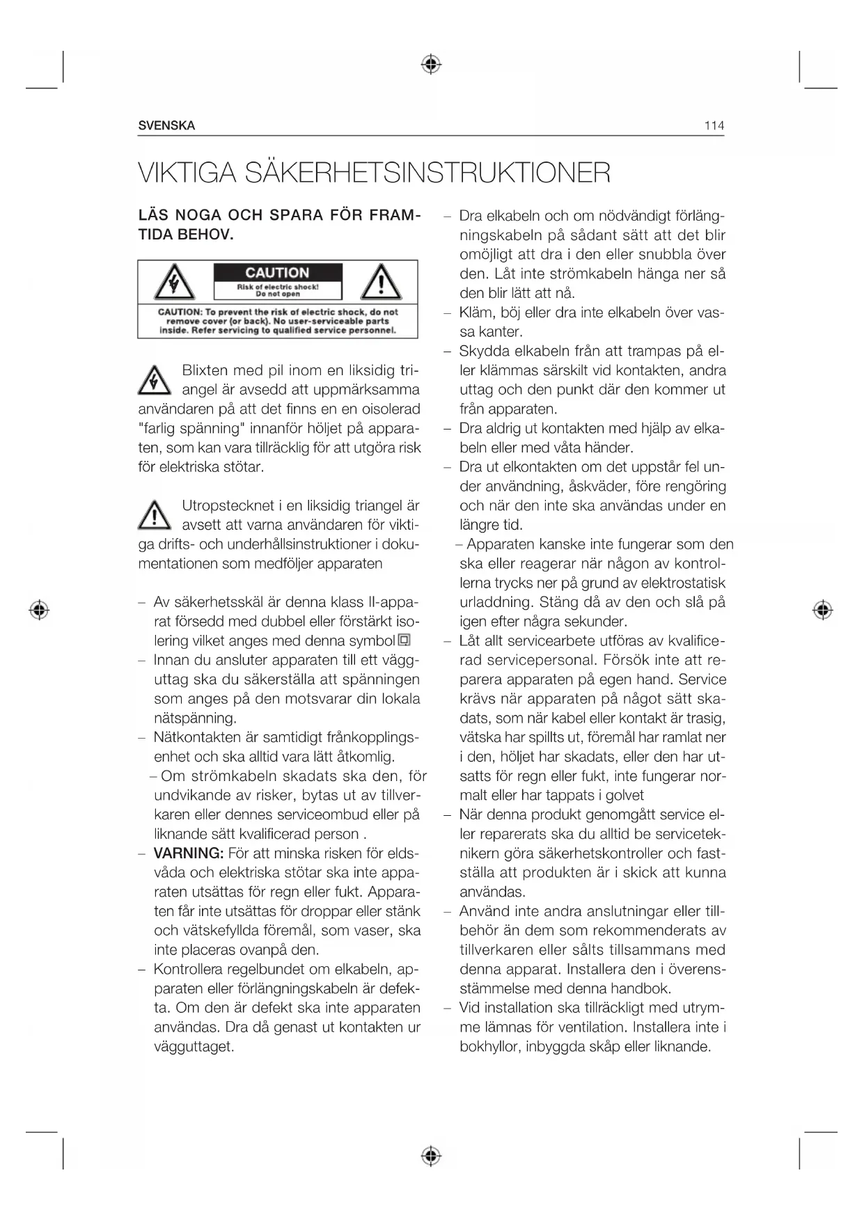Säkerhetsanmärkningar Blixten med pilspets inom en liksi- dig triangel är avsedd att varna användaren för förekomst av oi- solerad “farlig spänning” innanför denna ap- parats hölje, som kan vara tillräckligt hög för att utgöra en risk för elektriska stötar på människor och djur. Utropstecknet i en liksidig triangel är avsett att varna användaren för viktiga drifts- och underhållsin- struktioner i dokumentationen som medföl- jer apparaten. För att minska risken för brand eller el-stöt får inte apparaten utsättas för regn eller fukt. Apparaten får inte utsättas för droppande vätska eller stänk. Föremål som innehåller vätska, till exempel vaser, får inte placeras på apparaten. Viktiga säkerhetsanvisningar. Läs noga och spara för framtida bruk.