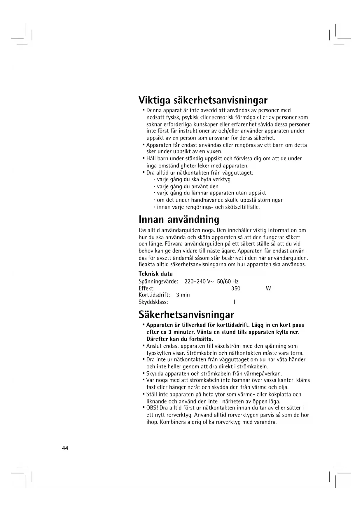 ▪ Apparaten är tillverkad för korttidsdrift. Lägg in en kort paus