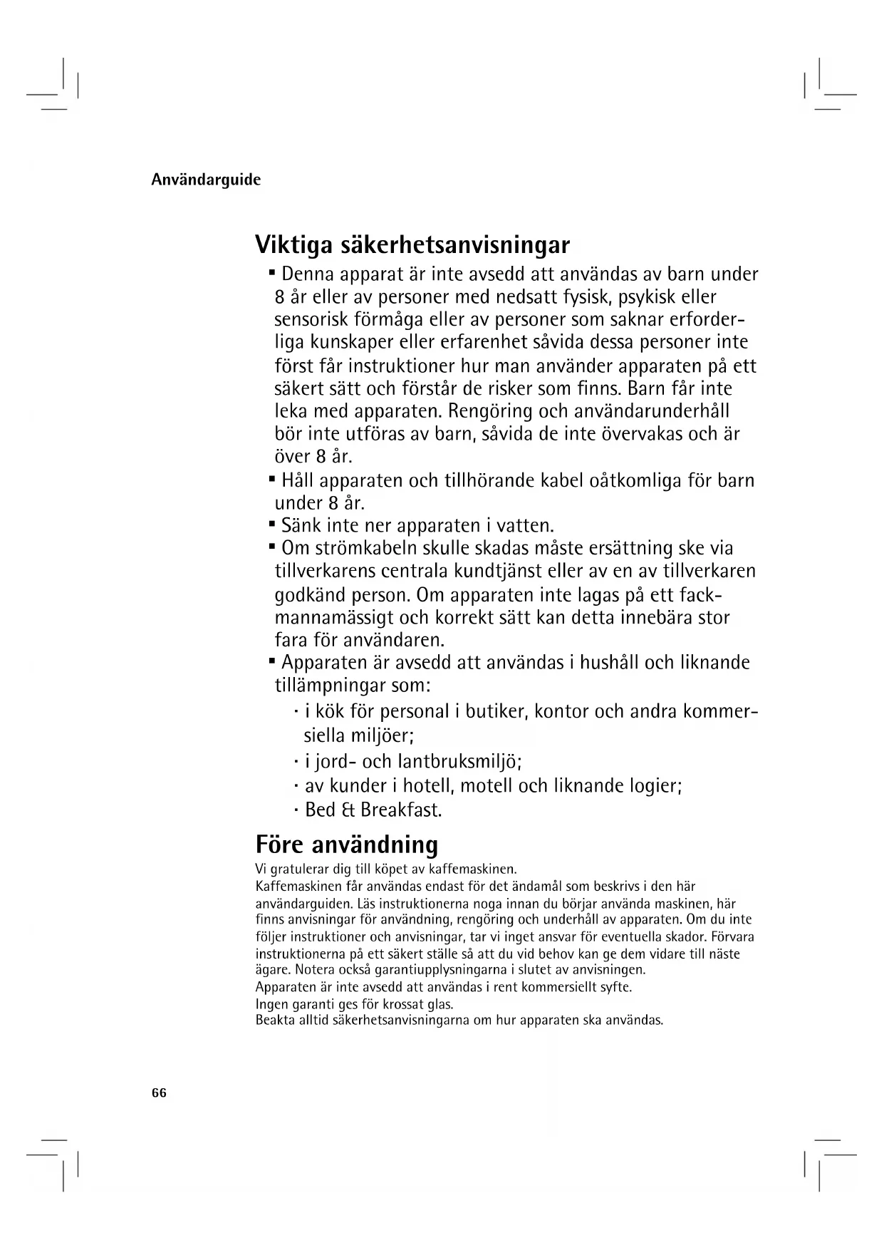 Kaffemaskinen får användas endast för det ändamål som beskrivs i den här