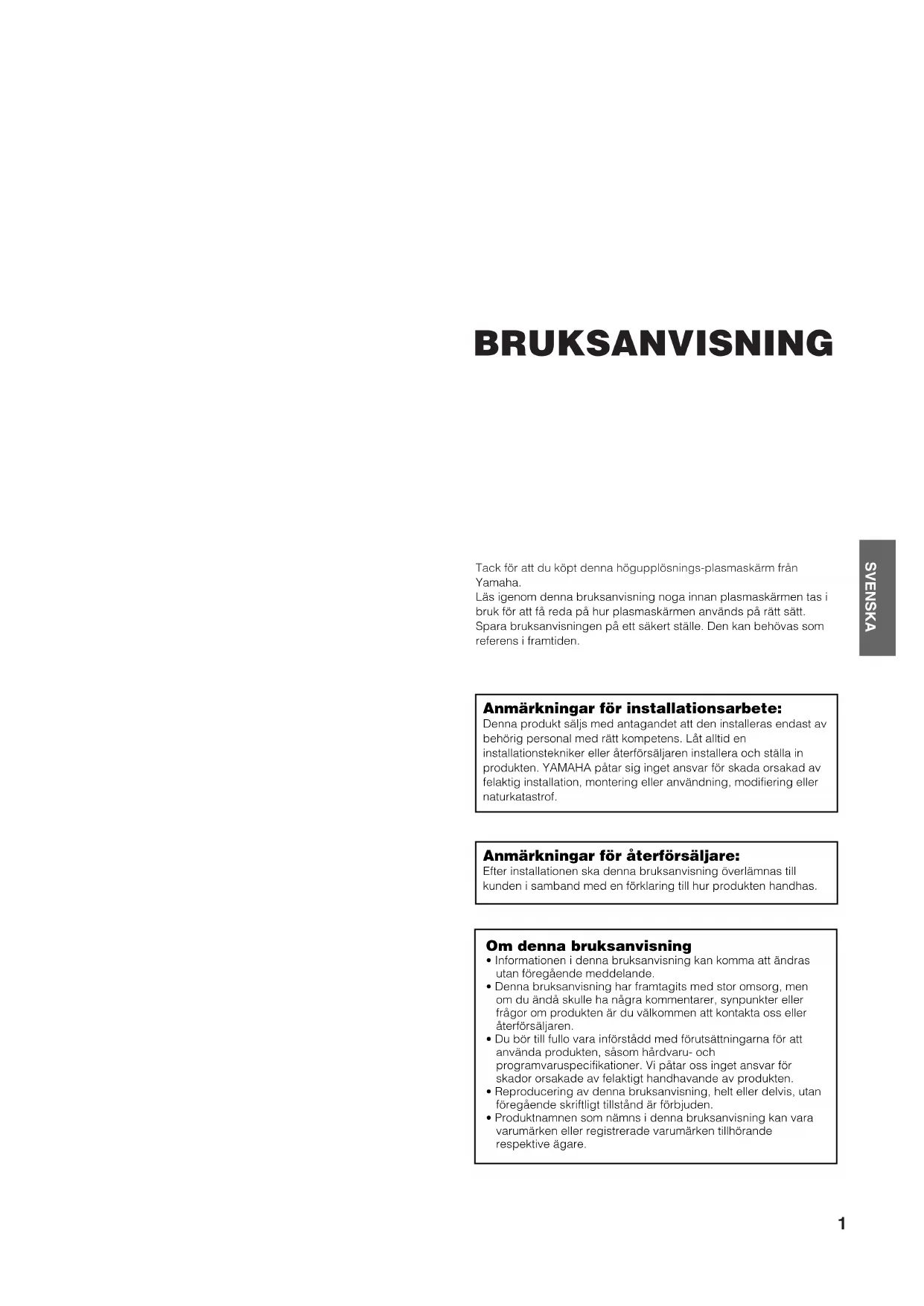 032PDM-4210GGER 2003.12.25 13:09 ページ56(ブラック版)1 SVENSKA BRUKSANVISNING Tack för att du köpt denna högupplösnings-plasmaskärm från Yamaha. Läs igenom denna bruksanvisning noga innan plasmaskärmen tas i bruk för att få reda på hur plasmaskärmen används på rätt sätt. Spara bruksanvisningen på ett säkert ställe. Den kan behövas som referens i framtiden. Anmärkningar för installationsarbete: Denna produkt säljs med antagandet att den installeras endast av behörig personal med rätt kompetens. Låt alltid en installationstekniker eller återförsäljaren installera och ställa in produkten. YAMAHA påtar sig inget ansvar för skada orsakad av felaktig installation, montering eller användning, modifiering eller naturkatastrof. Anmärkningar för återförsäljare: Efter installationen ska denna bruksanvisning överlämnas till kunden i samband med en förklaring till hur produkten handhas. Om denna bruksanvisning