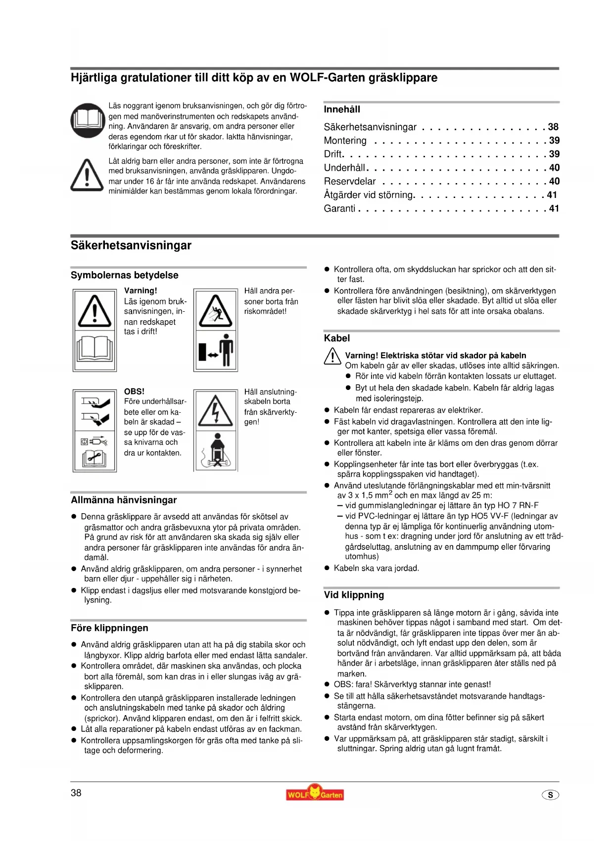 - Hjärtliga gratulationer till ditt köp av en WOLF-Garten gräsklippare Innehåll Säkerhetsanvisningar p. 38