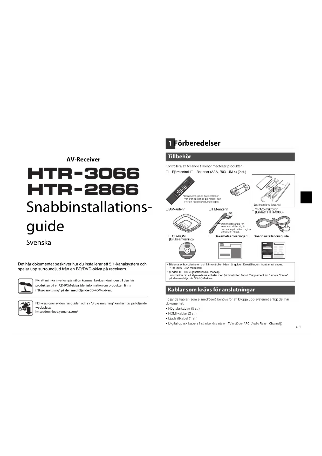 Tillbehör Fjärrkontroll Batterier (AAA, R03, UM-4) (2 st.)Sätt i batterierna åt rätt håll. AM-antenn FM-antenn YPAO-mikrofon (Endast HTR-3066) CD-ROM (Bruksanvisning) Säkerhetsanvisningar Snabbinstallationsguide• Bilderna av huvudenheten och fjärrkontrollen i den här guiden föreställer, om inget annat anges, HTR-3066 (USA-modellen).• (Endast HTR-3066 [australiensisk modell])Information om att styra externa enheter med fjärrkontrollen finns i ”Supplement for Remote Control” på den medföljande CD-ROM-skivan. Kablar som krävs för anslutningar *Den medföljande fjärrkontrollen varierar beroende på modell och i vilken region produkten köpts.*Den medföljande FM-antennen skiljer sig åt beroende på i vilken region produkten köpts. Snabbinstallations-