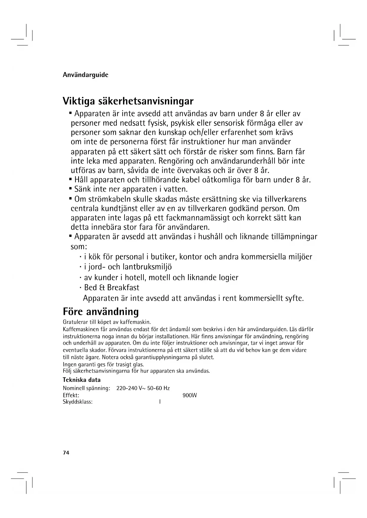 Kaffemaskinen får användas endast för det ändamål som beskrivs i den här användarguiden. Läs därför