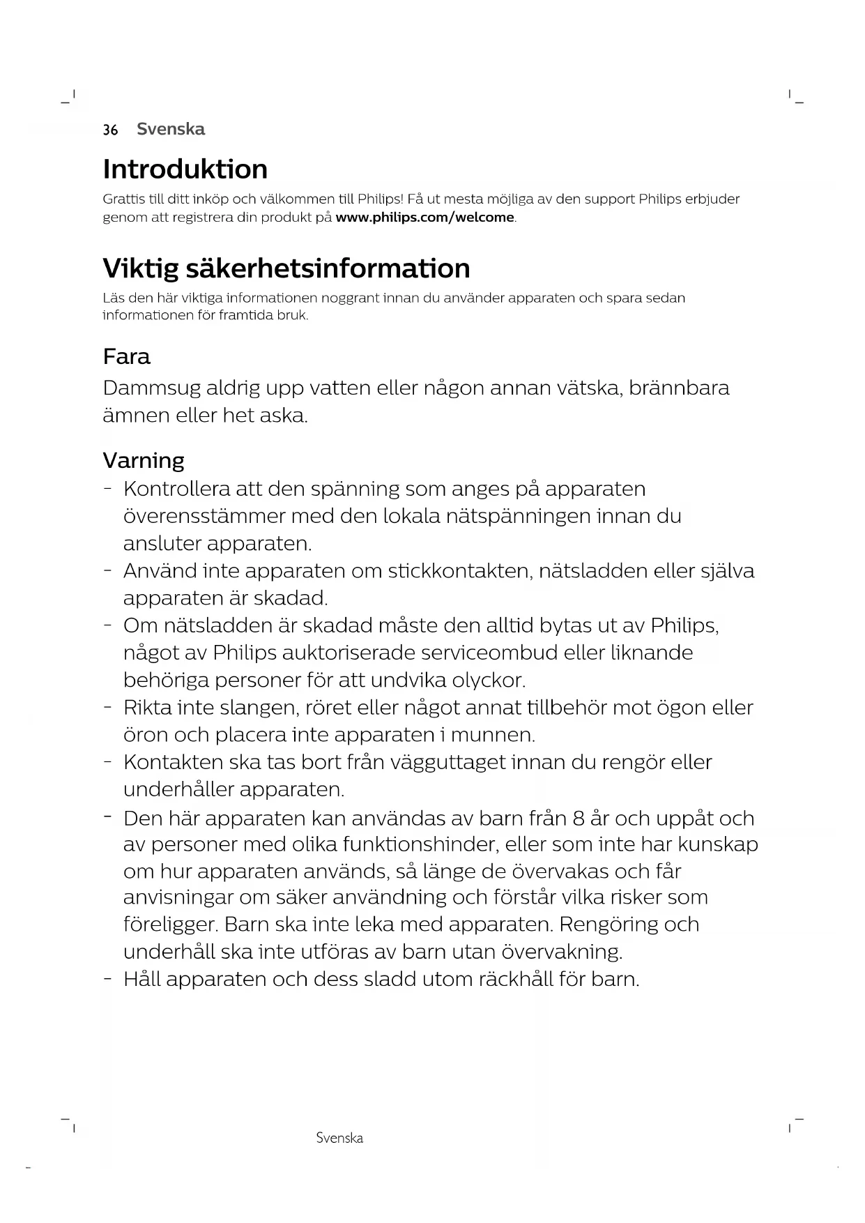 Introduktion Grattis till ditt inköp och välkommen till Philips! Få ut mesta möjliga av den support Philips erbjudergenom att registrera din produkt på www.philips.com/welcome. Viktig säkerhetsinformation Läs den här viktiga informationen noggrant innan du använder apparaten och spara sedaninformationen för framtida bruk. Fara