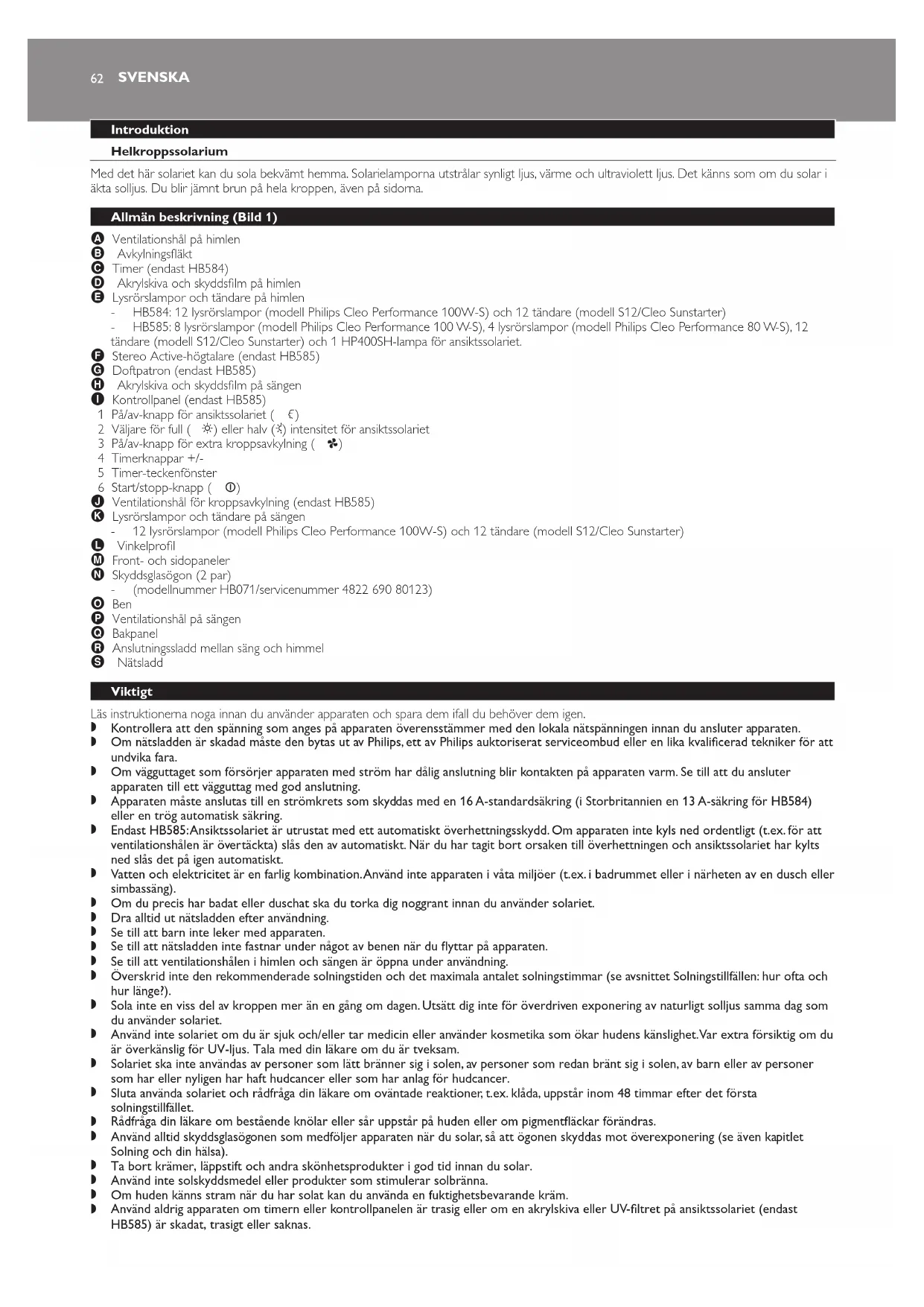 Ansiktssolariets lampa (endast HB585) får endast bytas ut av ett Philips-auktoriserat serviceombud.