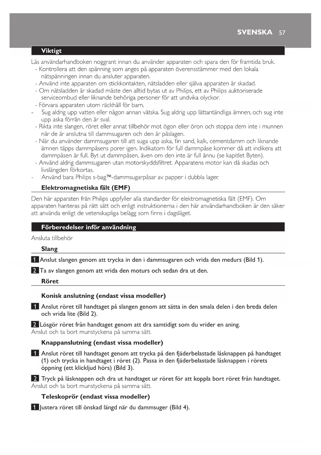 - Använd bara Philips s-bag`-dammsugarpåsar av papper i dubbla lager.
