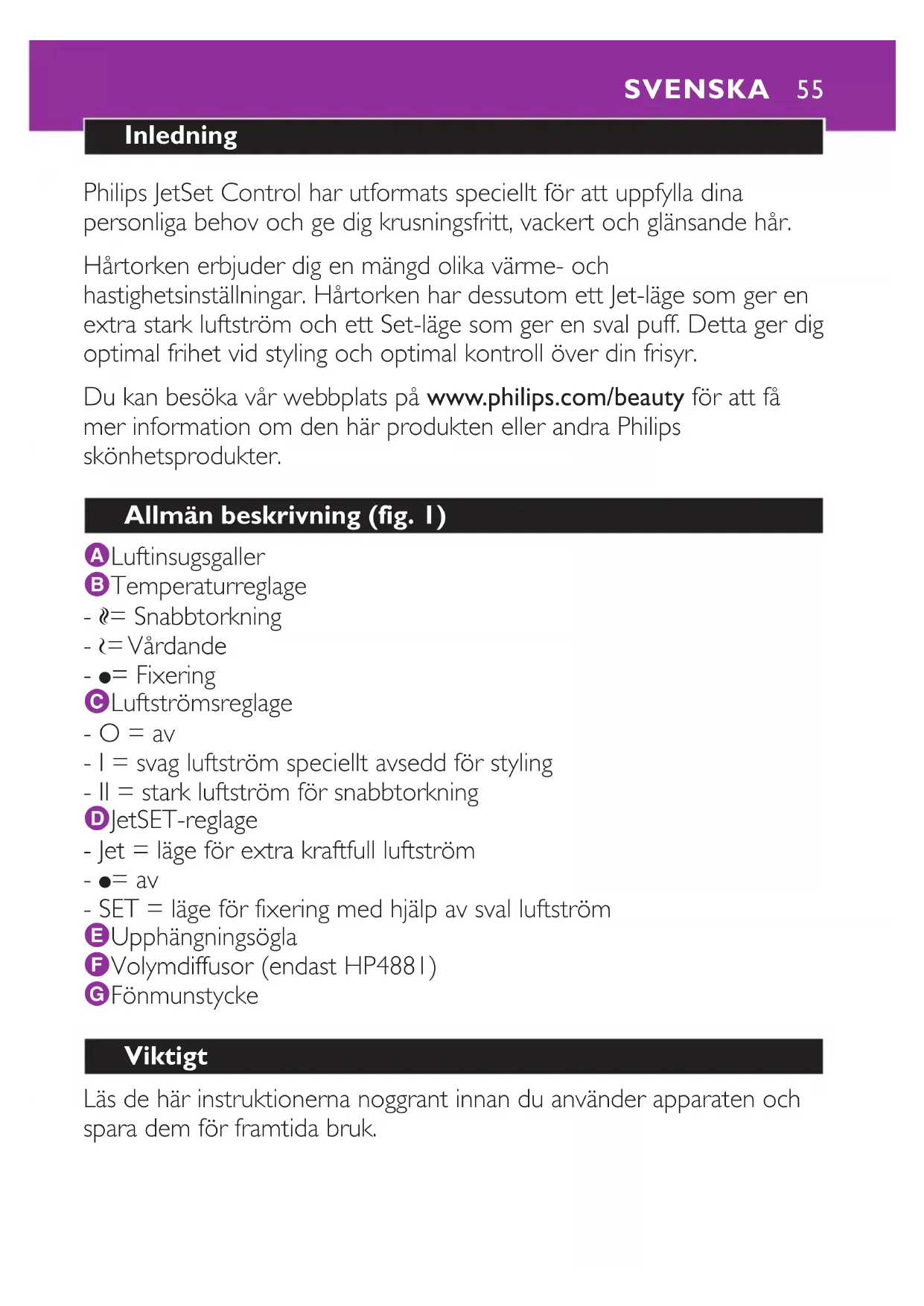 JetSet Control HP4880 - Hårtork PHILIPS - Gratis bruksanvisning och manual