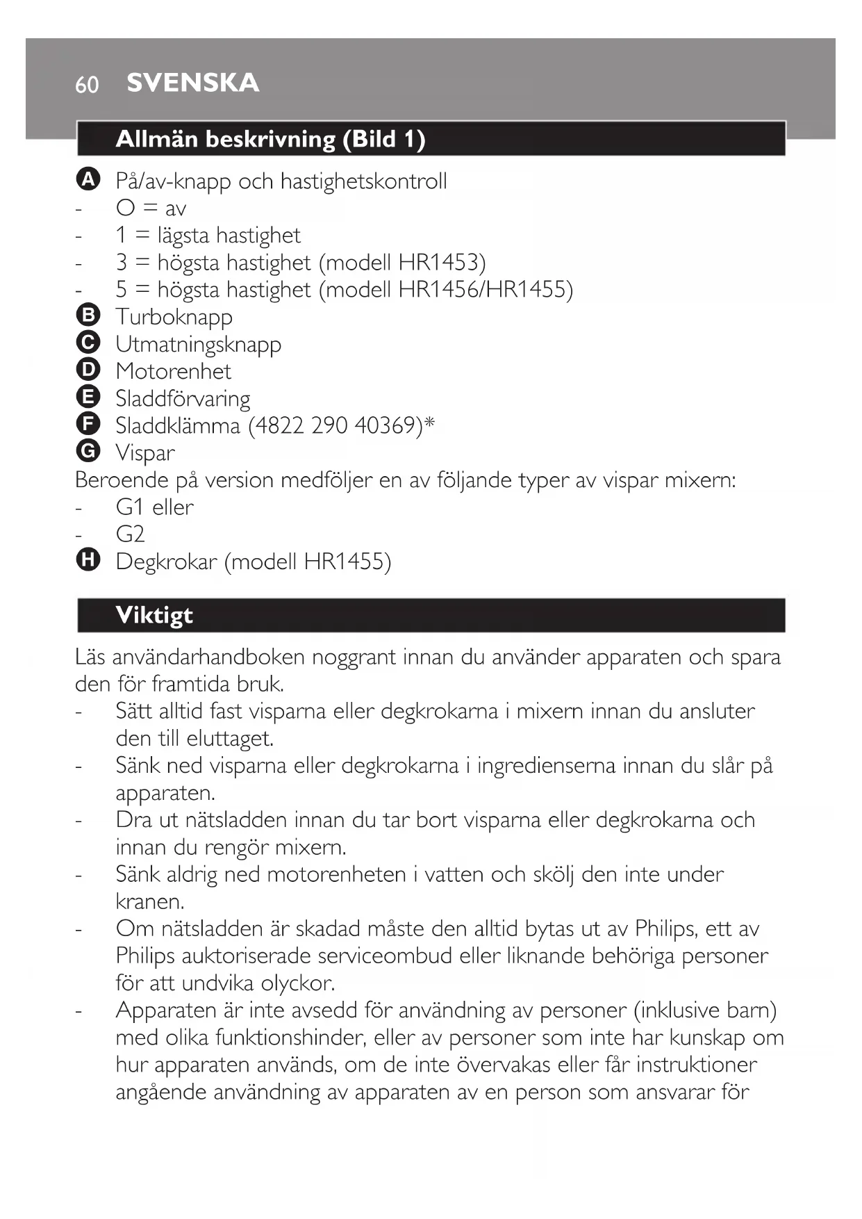 H Degkrokar (modell HR1455) Viktigt Läs användarhandboken noggrant innan du använder apparaten och spara den för framtida bruk. Sätt alltid fast visparna eller degkrokarna i mixern innan du ansluter den till eluttaget. Sänk ned visparna eller degkrokarna i ingredienserna innan du slår på apparaten. Dra ut nätsladden innan du tar bort visparna eller degkrokarna och innan du rengör mixern. Sänk aldrig ned motorenheten i vatten och skölj den inte under kranen. Om nätsladden är skadad måste den alltid bytas ut av Philips, ett av Philips auktoriserade serviceombud eller liknande behöriga personer för att undvika olyckor. Apparaten är inte avsedd för användning av personer (inklusive barn) med olika funktionshinder, eller av personer som inte har kunskap om hur apparaten används, om de inte övervakas eller får instruktioner angående användning av apparaten av en person som ansvarar för