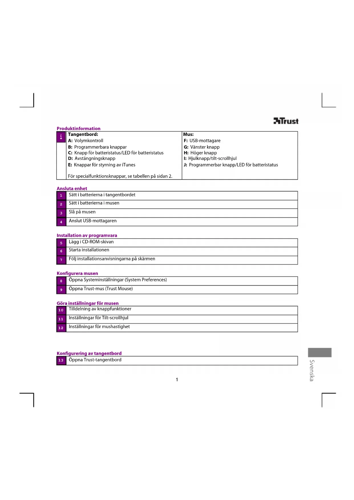 Produktinformation Tangentbord: A: Volymkontroll B: Programmerbara knappar C: Knapp för batteristatus/LED för batteristatus D: Avstängningsknapp E: Knappar för styrning av iTunes För specialfunktionsknappar, se tabellen på sidan 2. Mus: F: USB-mottagare G: Vänster knapp H: Höger knapp I: Hjulknapp/tilt-scrollhjul J: Programmerbar knapp/LED för batteristatus Ansluta enhet Sätt i batterierna i tangentbordet Sätt i batterierna i musen Slå på musen Anslut USB-mottagaren Installation av programvara Lägg i CD-ROM-skivan Starta installationen Följ installationsanvisningarna på skärmen Konfigurera musen Öppna Systeminställningar (System Preferences) Öppna Trust-mus (Trust Mouse) Göra inställningar för musen Tilldelning av knappfunktioner Inställningar för Tilt-scrollhjul Inställningar för mushastighet