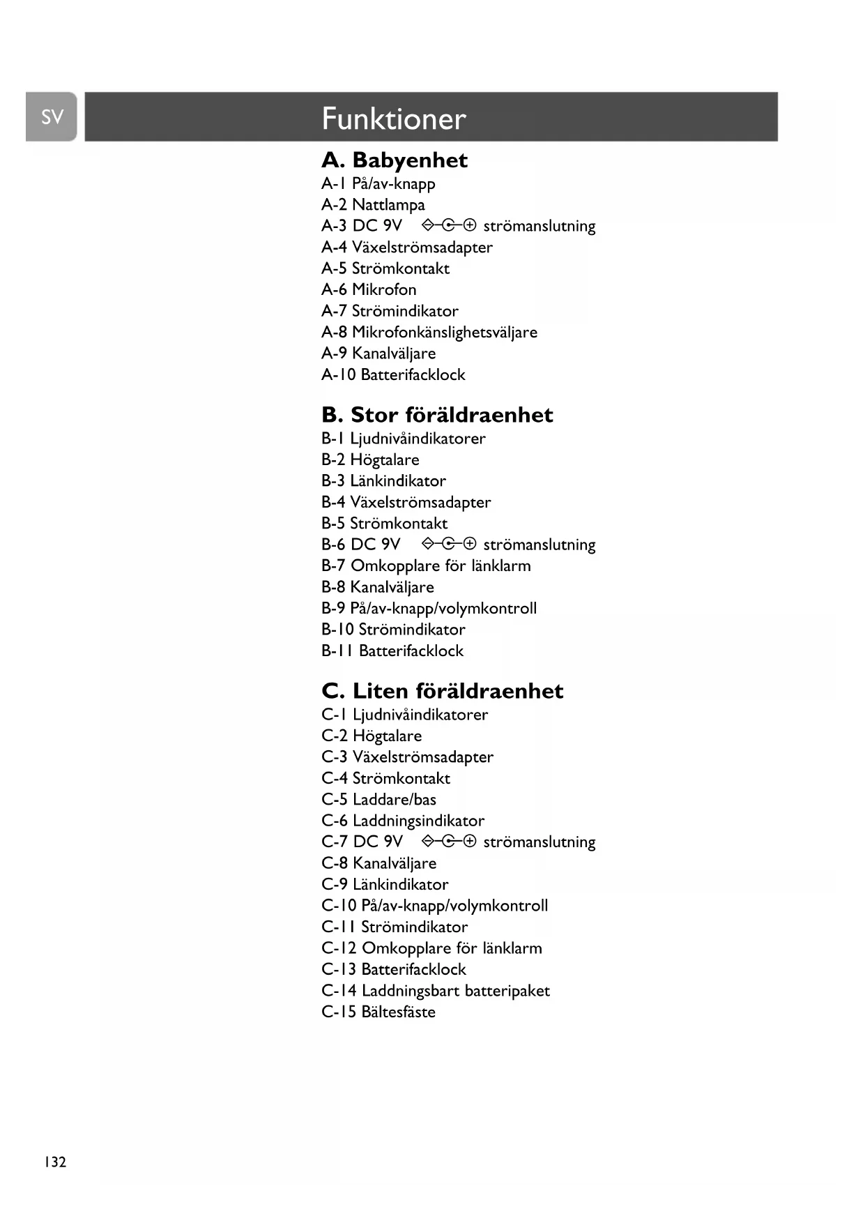 Laddningslampan (C-6) lyser alltid när föräldraenheten är isatt.
