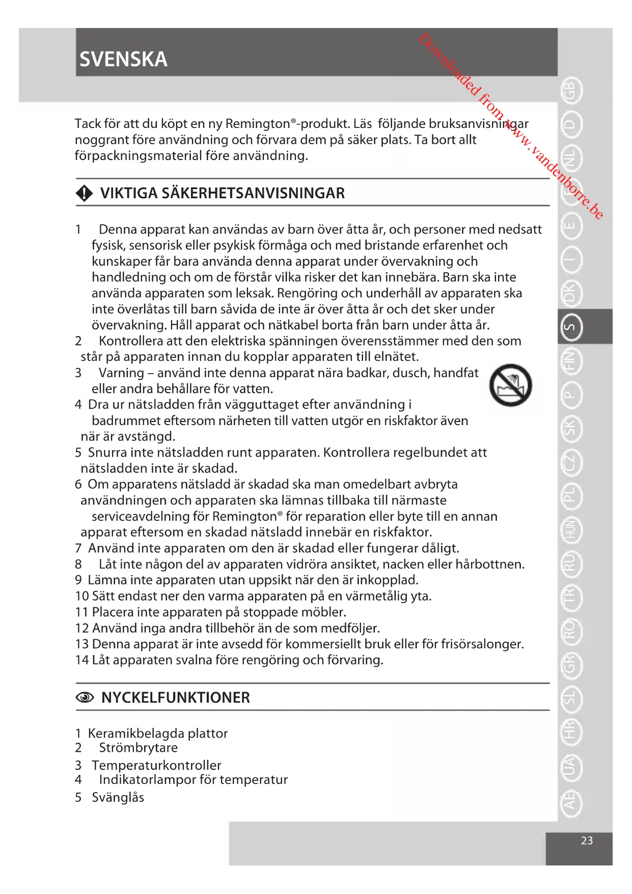 Foratundgåsundheds-ogmiljøproblemergrundetfarligestoeri elektriske og elektroniske forbrugsgoder, må apparater mærket med dette symbol ikke bortkastes sammen med usorteret husholdningsaald, men skal genanvendes eller genbruges. DANSK Downloaded from www.vandenborre.be23 TackförattduköptennyRemington®-produkt.Läsföljandebruksanvisningar noggrantföreanvändningochförvaradempåsäkerplats.Tabortallt förpackningsmaterialföreanvändning.