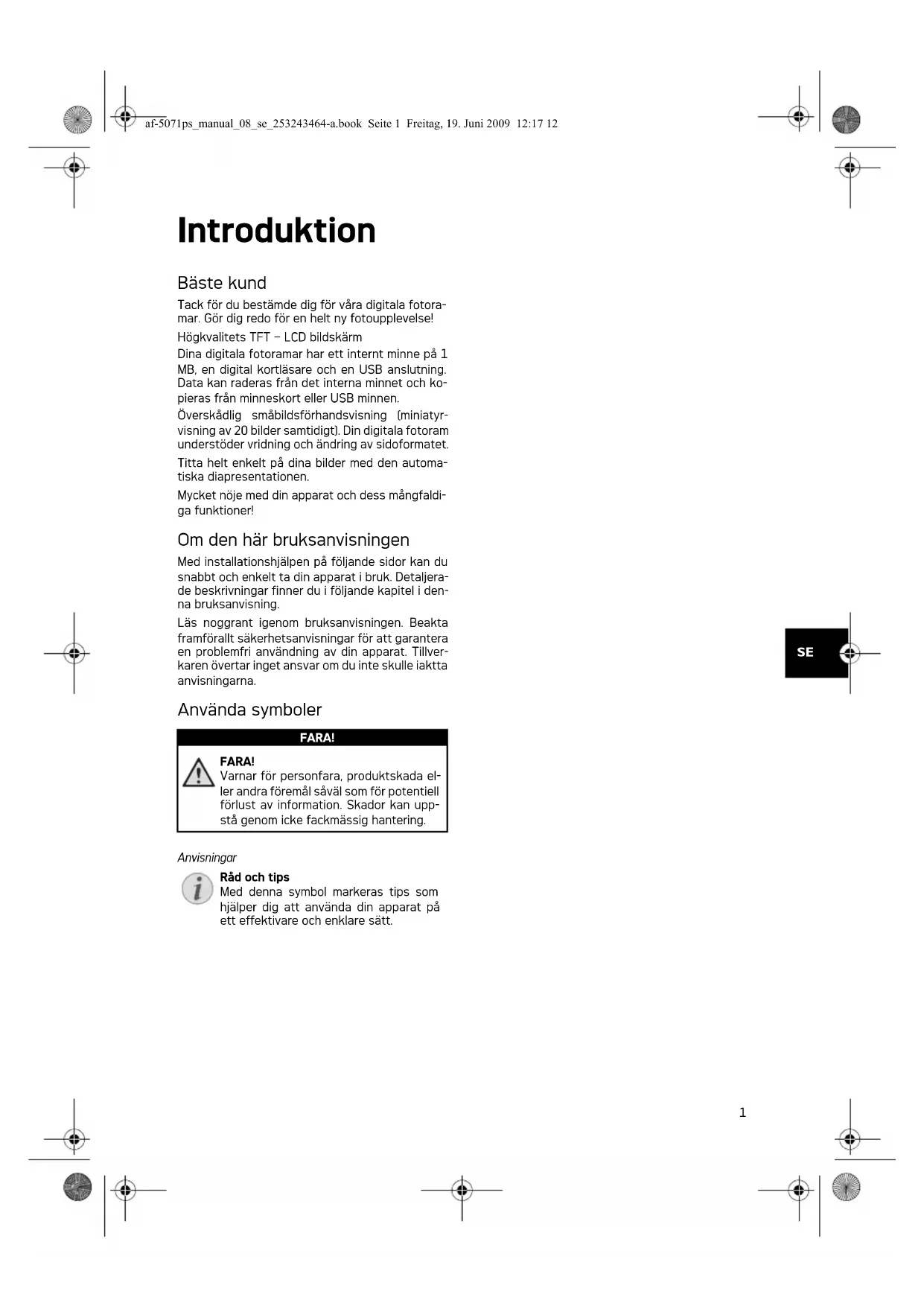 Introduktion Bäste kund Tack för du bestämde dig för våra digitala fotora- mar. Gör dig redo för en helt ny fotoupplevelse! Högkvalitets TFT – LCD bildskärm Minne Dina digitala fotoramar har ett internt minne på 1 MB, en digital kortläsare och en USB anslutning. Data kan raderas från det interna minnet och ko- pieras från minneskort eller USB minnen. Överskådlig småbildsförhandsvisning (miniatyr- visning av 20 bilder samtidigt). Din digitala fotoram understöder vridning och ändring av sidoformatet. Titta helt enkelt på dina bilder med den automa- tiska diapresentationen. Mycket nöje med din apparat och dess mångfaldi- ga funktioner! Om den här bruksanvisningen Med installationshjälpen på följande sidor kan du snabbt och enkelt ta din apparat i bruk. Detaljera- de beskrivningar finner du i följande kapitel i den- na bruksanvisning. Läs noggrant igenom bruksanvisningen. Beakta framförallt säkerhetsanvisningar för att garantera en problemfri användning av din apparat. Tillver- karen övertar inget ansvar om du inte skulle iaktta anvisningarna. Använda symboler Varning för fara Råd och tips FARA! FARA! Varnar för personfara, produktskada el- ler andra föremål såväl som för potentiell förlust av information. Skador kan upp- stå genom icke fackmässig hantering. Anvisningar Råd och tips Med denna symbol markeras tips som hjälper dig att använda din apparat på ett effektivare och enklare sätt. af-5071ps_manual_08_se_253243464-a.book Seite 1 Freitag, 19. Juni 2009 12:17 122