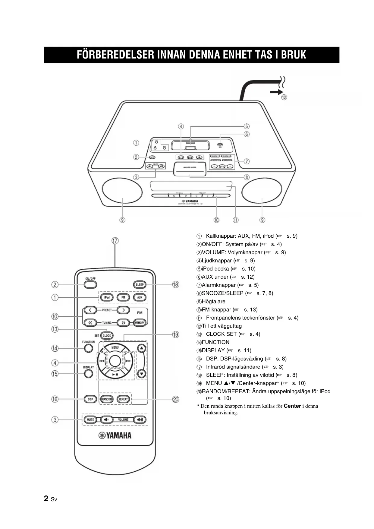 FÖRBEREDELSE ANVÄNDNING YTTERLIGARE INFORMATION FÖRBEREDELSER INNAN DENNA ENHET TAS I BRUK 2 Starta/stänga av systemet4Ställa klockan 4 ANVÄNDA SMIDIGA FUNKTIONER 5 Använda alarmfunktionerna 5Ställa in viloläge 8Ställa in dimmerläge8Växla DSP-läge 8 GRUNDLÄGGANDE FUNKTION 9