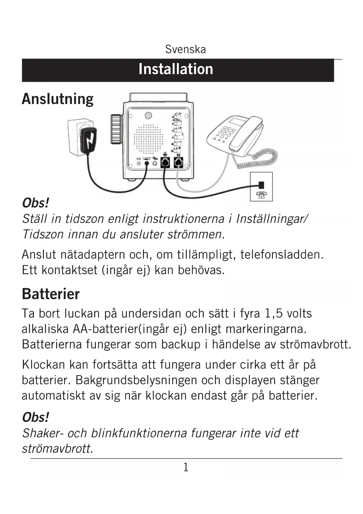 Automatisk tidsjustering inaktiverad. Tiden måste ställas in manuellt. Obs! Automatisk justering (RCC) kan ta upp till 30 minuter att slutföra. Under inställningen visar den analoga klockan inte rätt tid.9 Svenska Bakgrundsbelysning Inställningen av bakgrundsbelysningens styrka påverkar även lysdiodsdisplayen. Ingen bakgrundsbelysning. Om du trycker in alarmomkopplaren tänds bakgrundsbelysningen under 10 sekunder. Svag bakgrundsbelysning. Om du trycker in alarmomkopplaren blir bakgrundsbelysningen stark under 10 sekunder. Stark bakgrundsbelysning. Om nätadaptern kopplas ur stängs bakgrundsbelysningen automatiskt av för att spara på batterierna. Om du trycker in alarmomkopplaren tänds bakgrundsbelysningen under 10 sekunder.10 Svenska Skötsel och underhåll Telefonen är en tekniskt avancerad produkt och måste behandlas försiktigt. Oförsiktig behandling kan leda till att garantin blir ogiltig. Utsätt inte telefonen för fukt. Regn, snö, fukt och alla typer av vätskor innehåller ämnen som korroderar elektroniska kretsar. Om enheten blir blöt, måste du koppla ur nätströmmen, ta ur batterierna och låt enheten torka helt innan batterierna sätts in på nytt. Använd eller förvara inte telefonen i dammiga och smutsiga miljöer. Telefonens rörliga delar och elektroniska komponenter kan skadas. Förvara inte telefonen på varma platser. Höga temperaturer kan reducera livslängden för elektronisk utrustning, skada batterier och deformera eller smälta vissa plastmaterial. Förvara inte telefonen på kalla platser. När telefonen värms upp till normal temperatur kan kondens bildas på insidan och skada de elektroniska kretsarna. Försök aldrig att öppna telefonen på något annat sätt än de som anges här. Tappa inte telefonen. Slå inte på den och skaka den inte. Om den hanteras ovarsamt kan kretsarna och precisionsmekaniken skadas. Använd inte starka kemikalier för att rengöra telefonen. Råden ovan gäller för telefonen, batteriet, strömadaptern och andra tillbehör. Kontakta inköpsstället om enheten inte fungerar som den ska. Glöm inte inköpskvittot eller en kopia av fakturan.