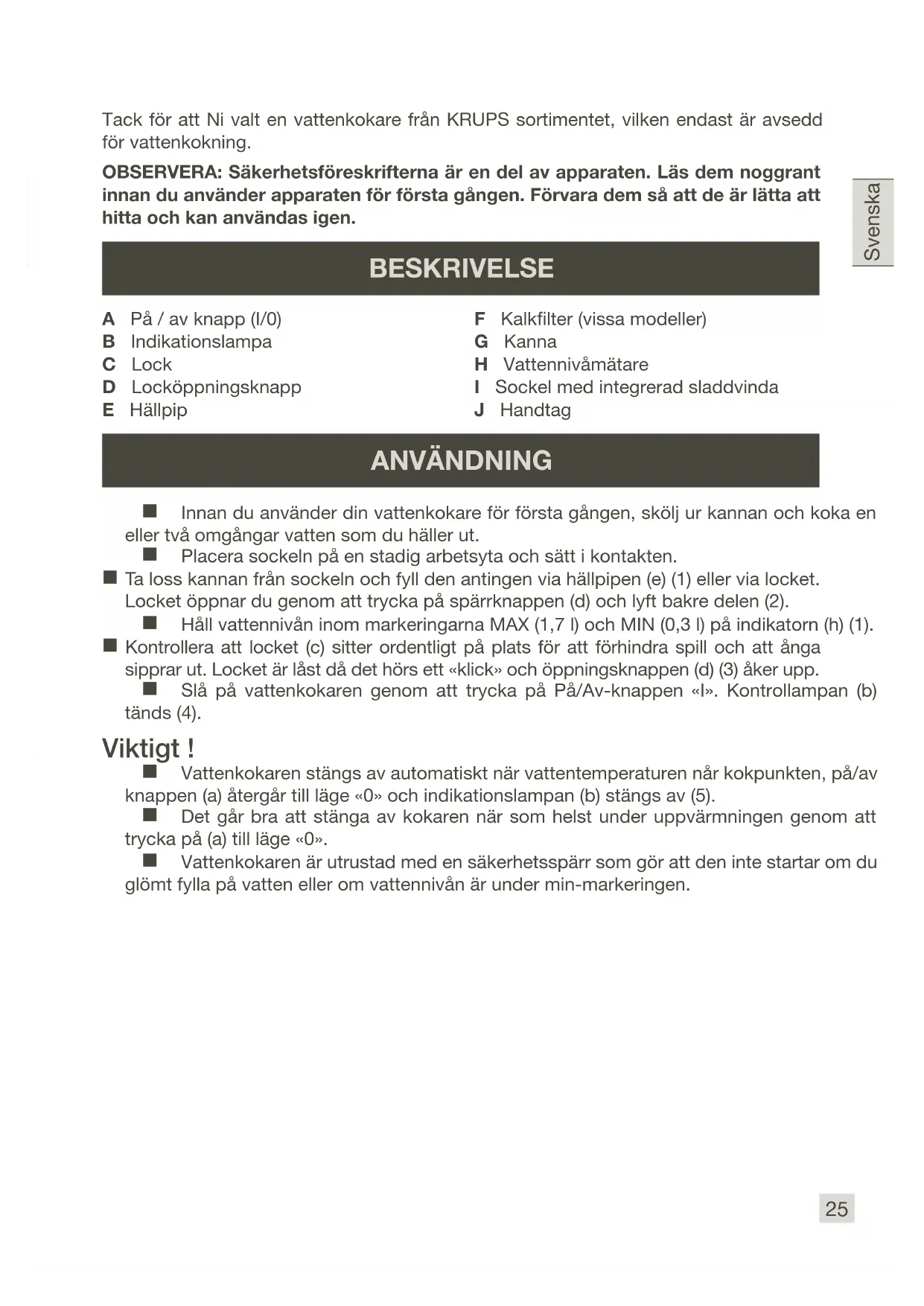 Tack för att Ni valt en vattenkokare från KRUPS sortimentet, vilken endast är avsedd