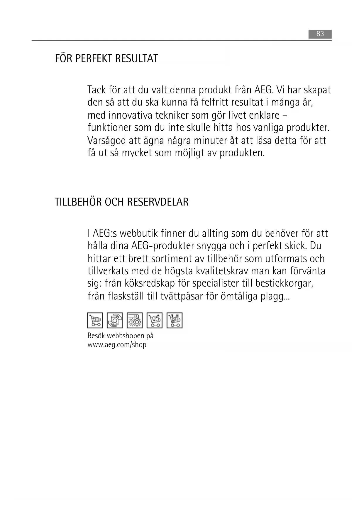 I AEG:s webbutik finner du allting som du behöver för att hålla dina AEG-produkter snygga och i perfekt skick. Du hittar ett brett sortiment av tillbehör som utformats och tillverkats med de högsta kvalitetskrav man kan förvänta sig: från köksredskap för specialister till bestickkorgar, från flaskställ till tvättpåsar för ömtåliga plagg... Besök webbshopen på www.aeg.com/shop 83INNEHÅLL 85 Säkerhetsinformation 87 Användning 88 Daglig användning 89 När maskinen används första gången 89 Råd och tips 89 Skötsel och rengöring 91 Om maskinen inte fungerar 93 Tekniska data 93 Installation 99 Buller 101 Miljöskydd Följande symboler används i denna bruksanvisning: Viktig information för din personliga säkerhet och information om hur skador undviks på apparaten. Allmän information och tips Miljöinformation Med reservation för ändringar 84 InnehållSÄKERHETSINFORMATION För din egen säkerhet och för att du skall kunna använda produkten på korrekt sätt är det viktigt att du noggrant läser igenom denna bruksanvisning, inklusive tips och varningar, in- nan du installerar och använder produkten första gången. För att undvika onödiga misstag och olyckor är det viktigt att alla som använder produkten har god kännedom om dess skötsel och skyddsanordningar. Spara denna bruksanvisning och se till att den följer med produkten om den flyttas eller säljs, så att alla som använder produkten får korrekt säker- hetsinformation och information om hur den skall skötas. För att minimera risken för skador på person och egendom är det viktigt att du läser och följer säkerhetsföreskrifterna i denna bruksanvisning. Tillverkaren ansvarar inte för skador orsakade av att föreskrifterna inte har följts. Säkerhet för barn och handikappade
