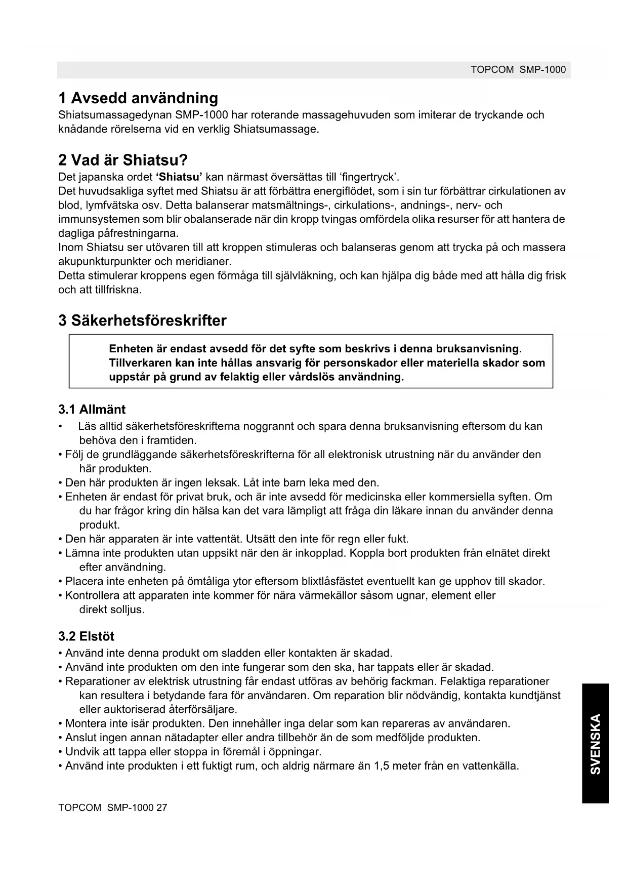 TOPCOM SMP-1000 La garantía no cubre los daños ocasionados por factores externos tales como relámpagos, agua o fuego como tampoco los daños causados durante el transporte. La garantía no será válida si el número de serie de las unidades se cambia, se elimina o resulta ilegible. Cualquier reclamación de la garantía se invalidará si la unidad ha sido reparada, alterada o modificada por el comprador. Este producto cumple con los requisitos esenciales y con el resto de indicaciones relevantes de la directiva 2004/108/CEE. Puede encontrarse la Declaración de conformidad en: http://www.topcom.net/cedeclarations.aspTOPCOM SMP-1000 27 TOPCOM SMP-1000 SVENSKA 1 Avsedd användning Shiatsumassagedynan SMP-1000 har roterande massagehuvuden som imiterar de tryckande och knådande rörelserna vid en verklig Shiatsumassage. 2 Vad är Shiatsu? Det japanska ordet ‘Shiatsu’ kan närmast översättas till ‘fingertryck’. Det huvudsakliga syftet med Shiatsu är att förbättra energiflödet, som i sin tur förbättrar cirkulationen av blod, lymfvätska osv. Detta balanserar matsmältnings-, cirkulations-, andnings-, nerv- och immunsystemen som blir obalanserade när din kropp tvingas omfördela olika resurser för att hantera de dagliga påfrestningarna. Inom Shiatsu ser utövaren till att kroppen stimuleras och balanseras genom att trycka på och massera akupunkturpunkter och meridianer. Detta stimulerar kroppens egen förmåga till självläkning, och kan hjälpa dig både med att hålla dig frisk och att tillfriskna. 3 Säkerhetsföreskrifter