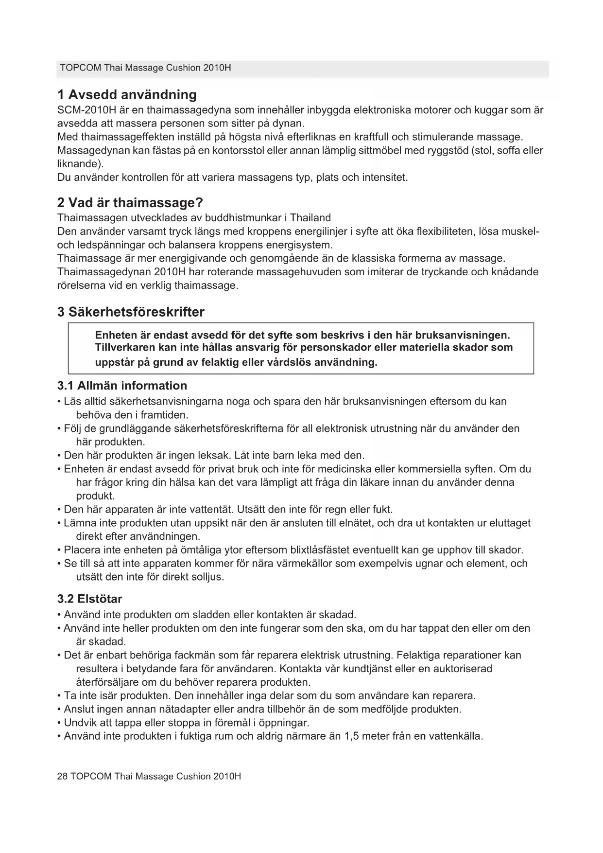 - Använd inte produkten i fuktiga rum och aldrig närmare än 1,5 meter från en vattenkälla. Enheten är endast avsedd för det syfte som beskrivs i den här bruksanvisningen. Tillverkaren kan inte hållas ansvarig för personskador eller materiella skador som uppstår på grund av felaktig eller vårdslös användning. HL_TMC-2010H D164.book Page 28 Friday, May 29, 2009 9:30 AMTOPCOM Thai Massage Cushion 2010H 29 TOPCOM Thai Massage Cushion 2010H SVENSKA
