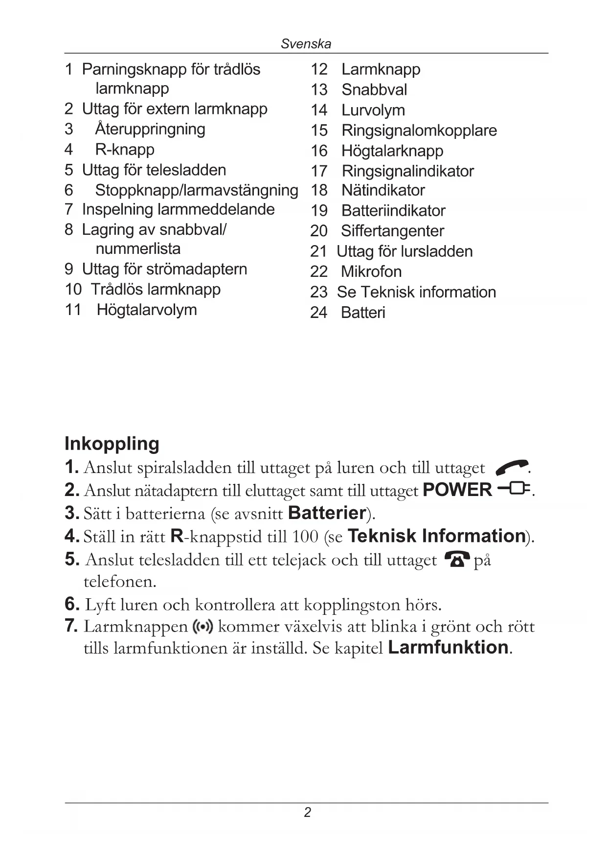 Svenska 1 Parningsknapp för trådlös larmknapp 2 Uttag för extern larmknapp 3 Återuppringning 4 R-knapp 5 Uttag för telesladden 6 Stoppknapp/larmavstängning 7 Inspelning larmmeddelande 8 Lagring av snabbval/ nummerlista 9 Uttag för strömadaptern 10 Trådlös larmknapp 11 Högtalarvolym 12 Larmknapp 13 Snabbval 14 Lurvolym 15 Ringsignalomkopplare 16 Högtalarknapp 17 Ringsignalindikator 18 Nätindikator 19 Batteriindikator 20 Siffertangenter 21 Uttag för lursladden 22 Mikrofon 23 Se Teknisk information 24 Batteri Inkoppling 1.Anslutspiralsladdentilluttagetpålurenochtilluttaget