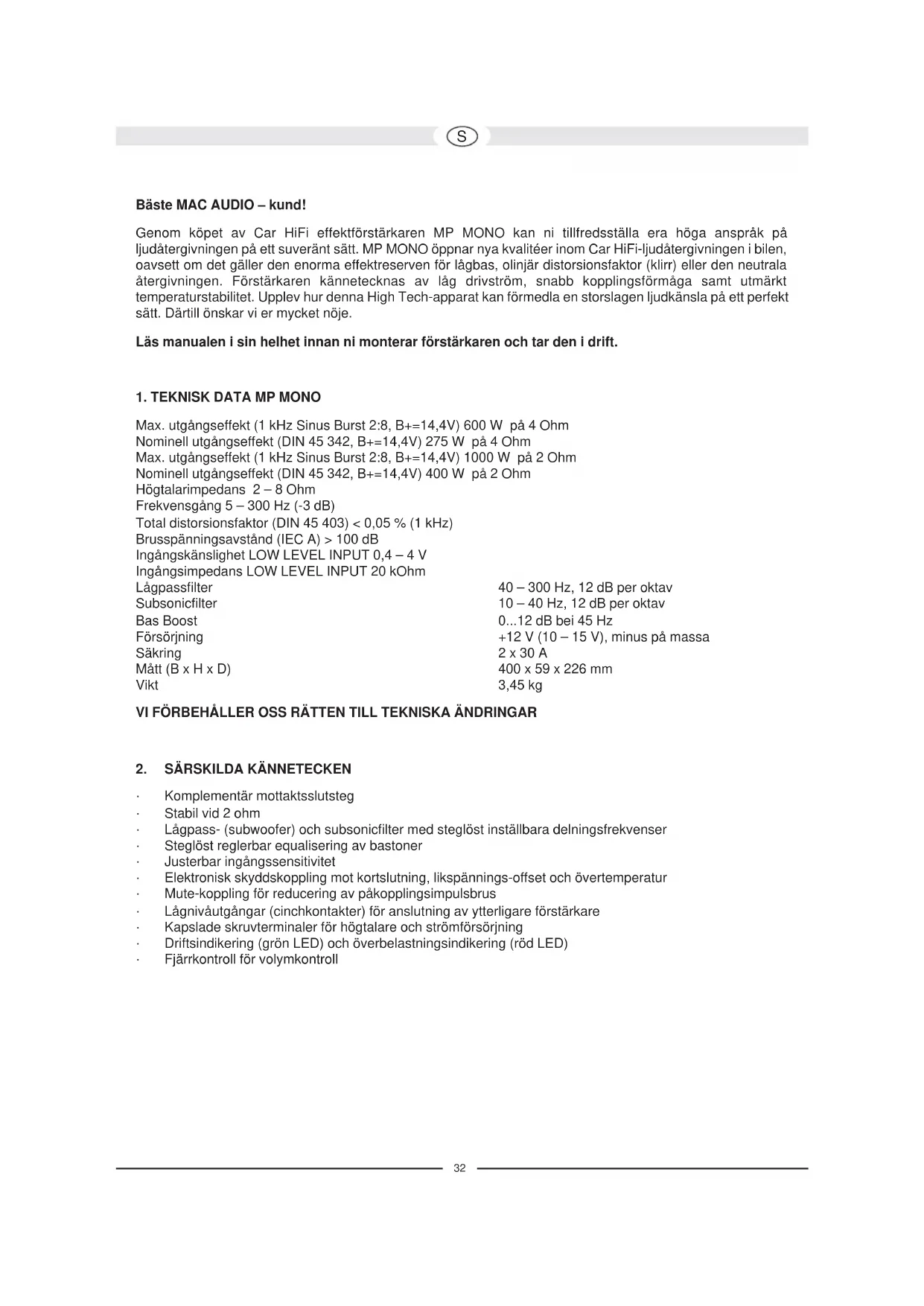 Bäste MAC AUDIO – kund! Genom köpet av Car HiFi effektförstärkaren MP MONO kan ni tillfredsställa era höga anspråk på ljudåtergivningen på ett suveränt sätt. MP MONO öppnar nya kvalitéer inom Car HiFi-ljudåtergivningen i bilen, oavsett om det gäller den enorma effektreserven för lågbas, olinjär distorsionsfaktor (klirr) eller den neutrala återgivningen. Förstärkaren kännetecknas av låg drivström, snabb kopplingsförmåga samt utmärkt temperaturstabilitet. Upplev hur denna High Tech-apparat kan förmedla en storslagen ljudkänsla på ett perfekt sätt. Därtill önskar vi er mycket nöje. Läs manualen i sin helhet innan ni monterar förstärkaren och tar den i drift.