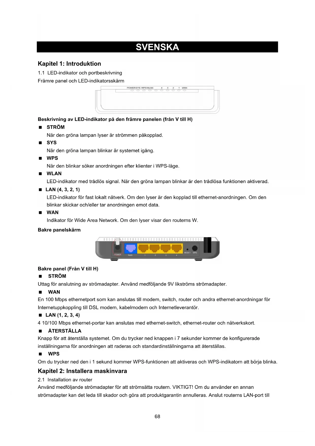 Främre panel och LED-indikatorsskärm Beskrivning av LED-indikator på den främre panelen (från V till H) STRÖM När den gröna lampan lyser är strömmen påkopplad. SYS När den gröna lampan blinkar är systemet igång. WPS När den blinkar söker anordningen efter klienter i WPS-läge. WLAN LED-indikator med trådlös signal. När den gröna lampan blinkar är den trådlösa funktionen aktiverad. LAN (4, 3, 2, 1) LED-indikator för fast lokalt nätverk. Om den lyser är den kopplad till ethernet-anordningen. Om den blinkar skickar och/eller tar anordningen emot data. WAN Indikator för Wide Area Network. Om den lyser visar den routerns W. Bakre panelskärm Bakre panel (Från V till H) STRÖM Uttag för anslutning av strömadapter. Använd medföljande 9V likströms strömadapter. WAN En 100 Mbps ethernetport som kan anslutas till modem, switch, router och andra ethernet-anordningar för Internetuppkoppling till DSL modem, kabelmodem och Internetleverantör. LAN (1, 2, 3, 4) 4 10/100 Mbps ethernet-portar kan anslutas med ethernet-switch, ethernet-router och nätverkskort. ÅTERSTÄLLA Knapp för att återställa systemet. Om du trycker ned knappen i 7 sekunder kommer de konfigurerade inställningarna för anordningen att raderas och standardinställningarna att återställas. WPS Om du trycker ned den i 1 sekund kommer WPS-funktionen att aktiveras och WPS-indikatorn att börja blinka. Kapitel 2: Installera maskinvara