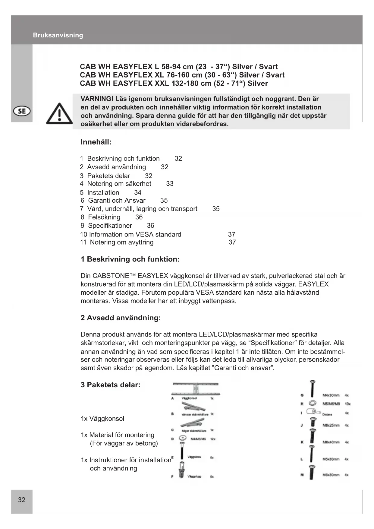 Denna produkt används för att montera LED/LCD/plasmaskärmar med specifika skärmstorlekar, vikt och monteringspunkter på vägg, se "Specifikationer" för detaljer. Alla annan användning än vad som specificeras i kapitel 1 är inte tillåten. Om inte bestämmelser och noteringar observeras eller följs kan det leda till allvarliga olyckor, personskador samt även skador på egendom. Läs kapitlet "Garanti och ansvar".