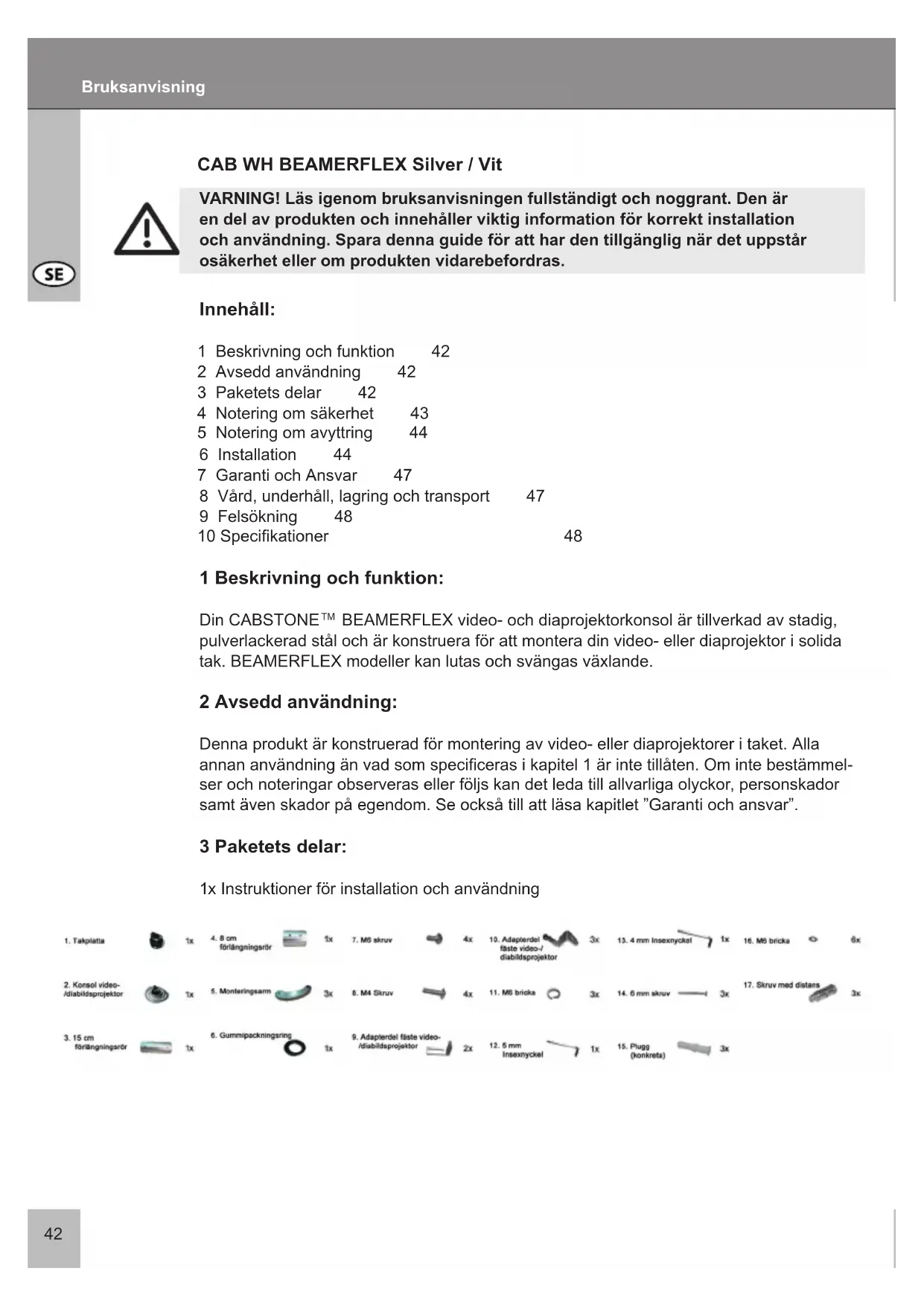 BEAMERFLEX video- och diaprojektorkonsol är tillverkad av stadig, pulverlackerad stål och är konstruera för att montera din video- eller diaprojektor i solida tak. BEAMERFLEX modeller kan lutas och svängas växlande. 2 Avsedd användning: Denna produkt är konstruerad för montering av video- eller diaprojektorer i taket. Alla annan användning än vad som speciceras i kapitel 1 är inte tillåten. Om inte bestämmel- ser och noteringar observeras eller följs kan det leda till allvarliga olyckor, personskador samt även skador på egendom. Se också till att läsa kapitlet ”Garanti och ansvar”. 3 Paketets delar: 1x Instruktioner för installation och användning Bruksanvisning43