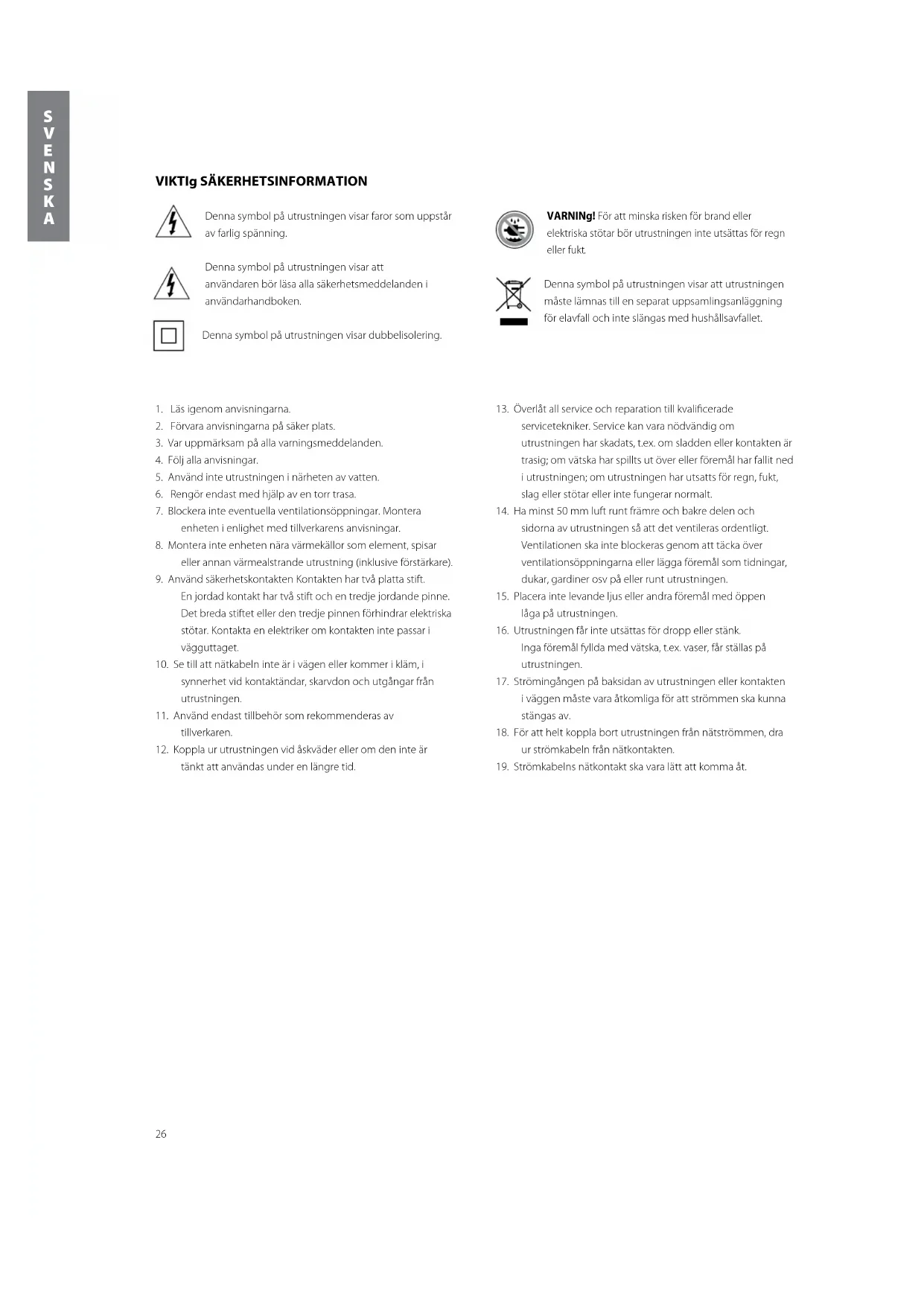VIKTIg SÄKERHETSINFORMATION Denna symbol på utrustningen visar faror som uppstår av farlig spänning. Denna symbol på utrustningen visar att användaren bör läsa alla säkerhetsmeddelanden i användarhandboken. Denna symbol på utrustningen visar dubbelisolering. VARNINg! För att minska risken för brand eller elektriska stötar bör utrustningen inte utsättas för regn eller fukt