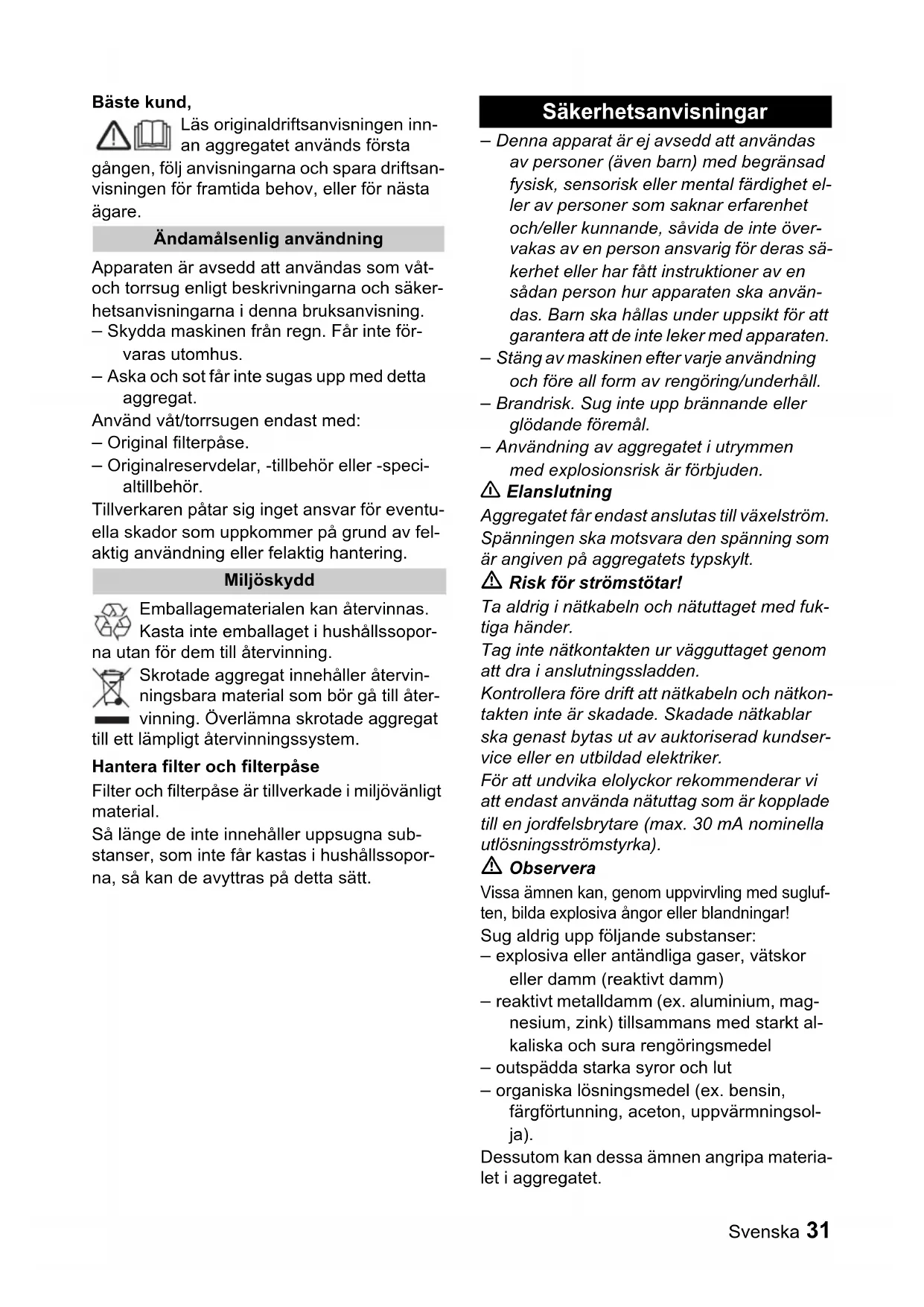 och torrsug enligt beskrivningarna och säker-