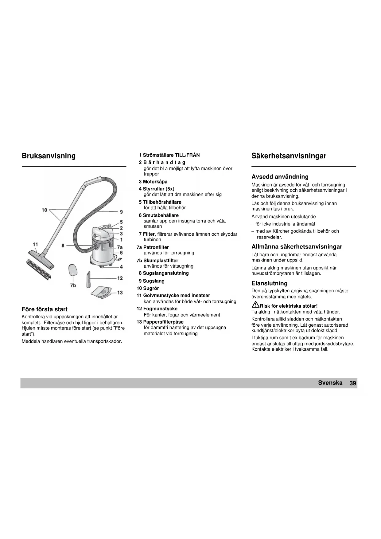 Försäkran om överensstämmelse Härmed försäkrar vi att den enligt nedan angivna maskinen till konstruktion, byggnadssätt och i av oss levererat utförande motsvarar tillämpliga baskrav beträffande säkerhet och hälsa enligt EU-direktiven. Vid ändringar på maskinen som icke avtalats med oss upphör denna försäkran att gälla.Produkt: Våt- och torrsugareTy p: 1.336-xxxTillämpliga EU-direktiv:EG maskindirektiv (98/37/EG)EG lågspänningsdirektiv (73/23/EEG) ändrat genom 93/68/EEGEG direktiv för elöverkänslighet (89/336/EEG) ändrat genom 91/263/EEG, 92/31/EEG, 93/68/EEGTillämpade harmoniserade normer:DIN EN 60 335 – 1 DIN EN 60 335 – 2 – 2 DIN EN 55 014 – 1 : 2000 + A1: 2001 DIN EN 55 014 – 2 : 1997DIN EN 61 000 – 3 – 2 : 2000DIN EN 61 000 – 3 – 3 : 1995 + A1: 2001Tillämpade nationella normer: -Vi har genom interna åtgärder säkerställt, att serietillverkade maskiner alltid motsvarar aktuella EU-direktiv och tillämpade normer.De undertecknade agerar på uppdrag av och med fullmakt av företagsledningen.Alfred Kärcher GmbH & Co. KGCleaning SystemsAlfred-Kärcher-Str. 28-40P.O. Box 160D-71349 Winnenden Tekniska data