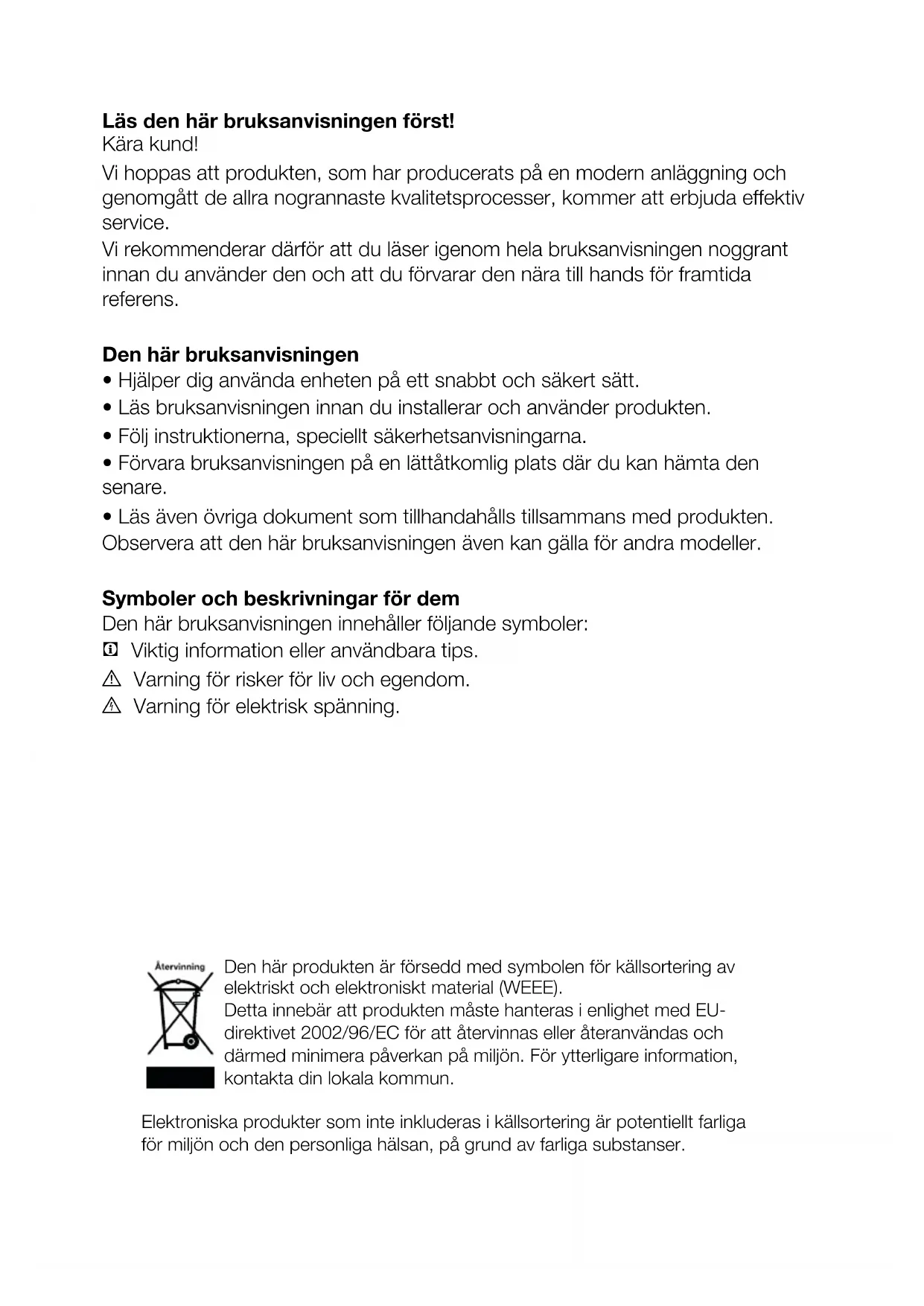 - Läs även övriga dokument som tillhandahålls tillsammans med produkten. Observera att den här bruksanvisningen även kan gälla för andra modeller. Symboler och beskrivningar för dem Den här bruksanvisningen innehåller följande symboler: C Viktig information eller användbara tips. A Varning för risker för liv och egendom. B Varning för elektrisk spänning. Den här produkten är försedd med symbolen för källsortering av elektriskt och elektroniskt material (WEEE). Detta innebär att produkten måste hanteras i enlighet med EU- direktivet 2002/96/EC för att återvinnas eller återanvändas och därmed minimera påverkan på miljön. För ytterligare information, kontakta din lokala kommun. Elektroniska produkter som inte inkluderas i källsortering är potentiellt farliga för miljön och den personliga hälsan, på grund av farliga substanser.SV