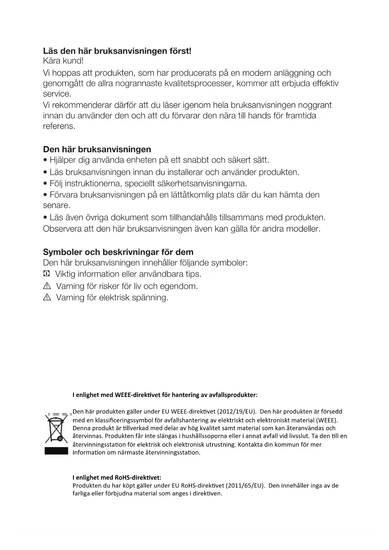 - Den här bruksanvisningen ska lämnas till den nya ägaren av produkten när den lämnas till andra.